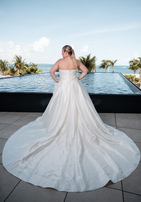 Calling all minimalist brides! DELANCEY x Édition is here to give you something sleek and modern yet with a little bit of extra glamour. She has a figure-flattering draped bodice as well as a sexy high slit that will make everyone's heads turn!
