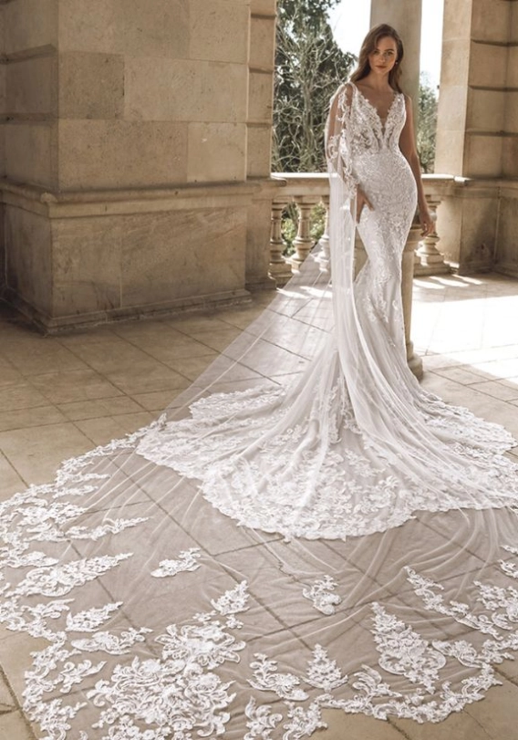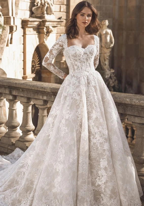 Formal cathedral ceremonies, majestic ballroom receptions, castle weddings, and brides seeking upgraded elegance and dramatic flair.