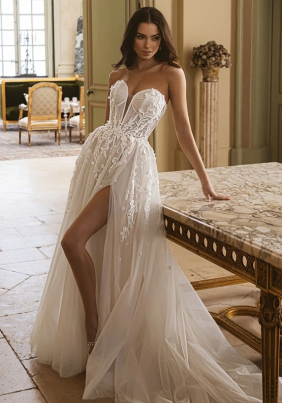 A ballgown wedding dress exudes fairytale grandeur, with a cinched bodice and a voluminous skirt. Layers of luxurious fabrics like tulle, mikado, and structured lace create an unforgettable princess moment.