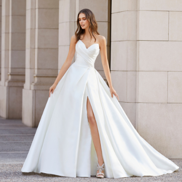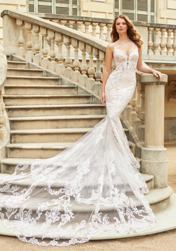 Sexy and sparkly, ALESSIA is a beautiful mermaid silhouette gown that is guaranteed to shimmer and shine throughout the day. Her plunging neckline and double sculpted train will leave everyone starstruck!