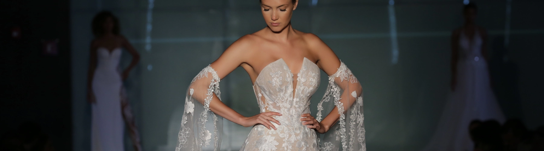More of ÉLYSÉE's intricate designs were shown with the collection's coveted accessories. The JEANNE sleeves (above right) stunned many with their unique design and romantic feel. While the sleeves were paired with the SOPHIE gown (above right), all accessories could easily be switched between silhouettes, making them versatile for any bride.