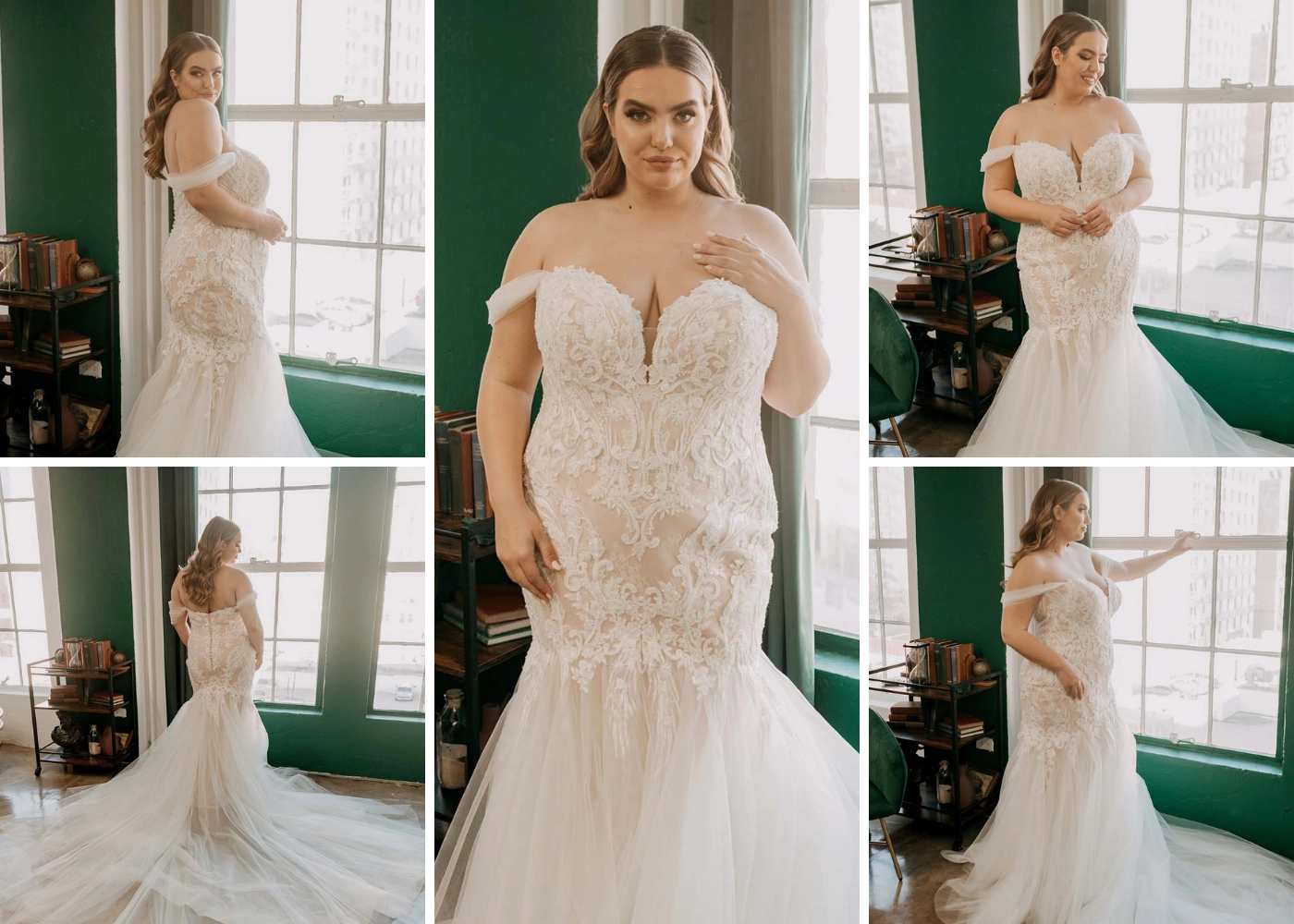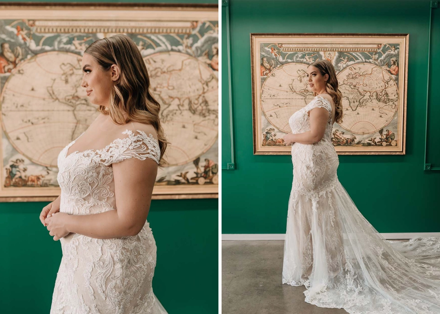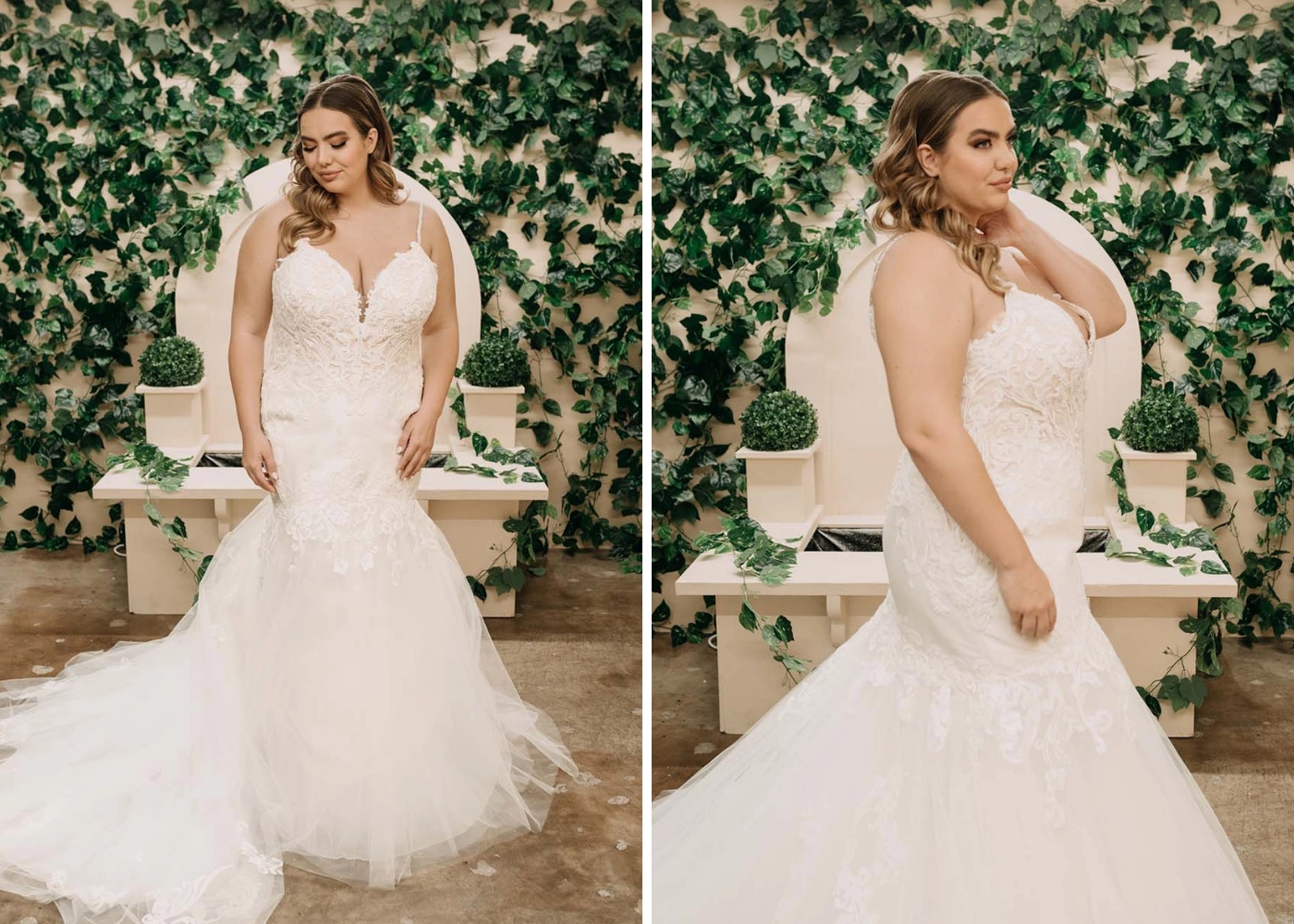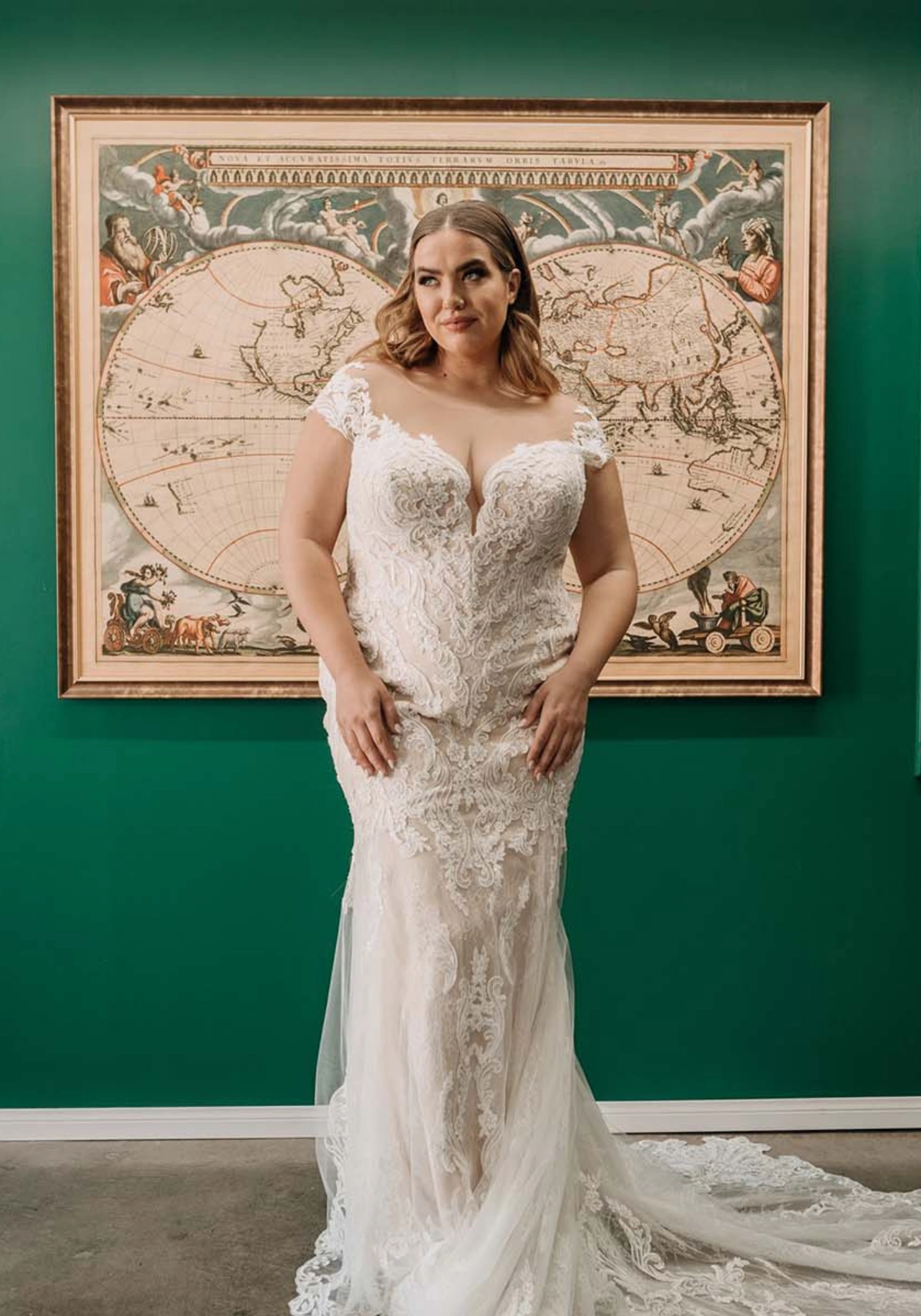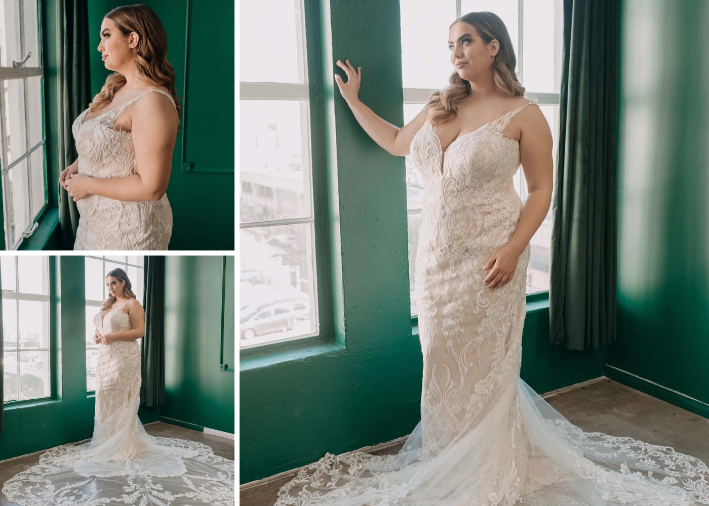 The gown we all know and love... FRANÇOISE X Édition! Her unique neckline, the deep side cut-outs, and the double sculpted lace train are just a few of the details that make this gown super flattering on every body.