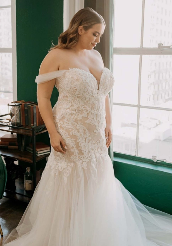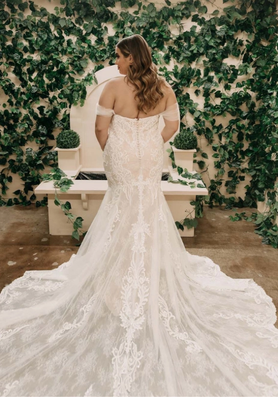 ATHÉNAÏS X Édition bringing all the beautiful feels! Featuring sexy off-the-shoulder sleeves and romantic floral lace details cascading into a beautiful, dramatic lace train, this gown is jaw-droppingly gorgeous!