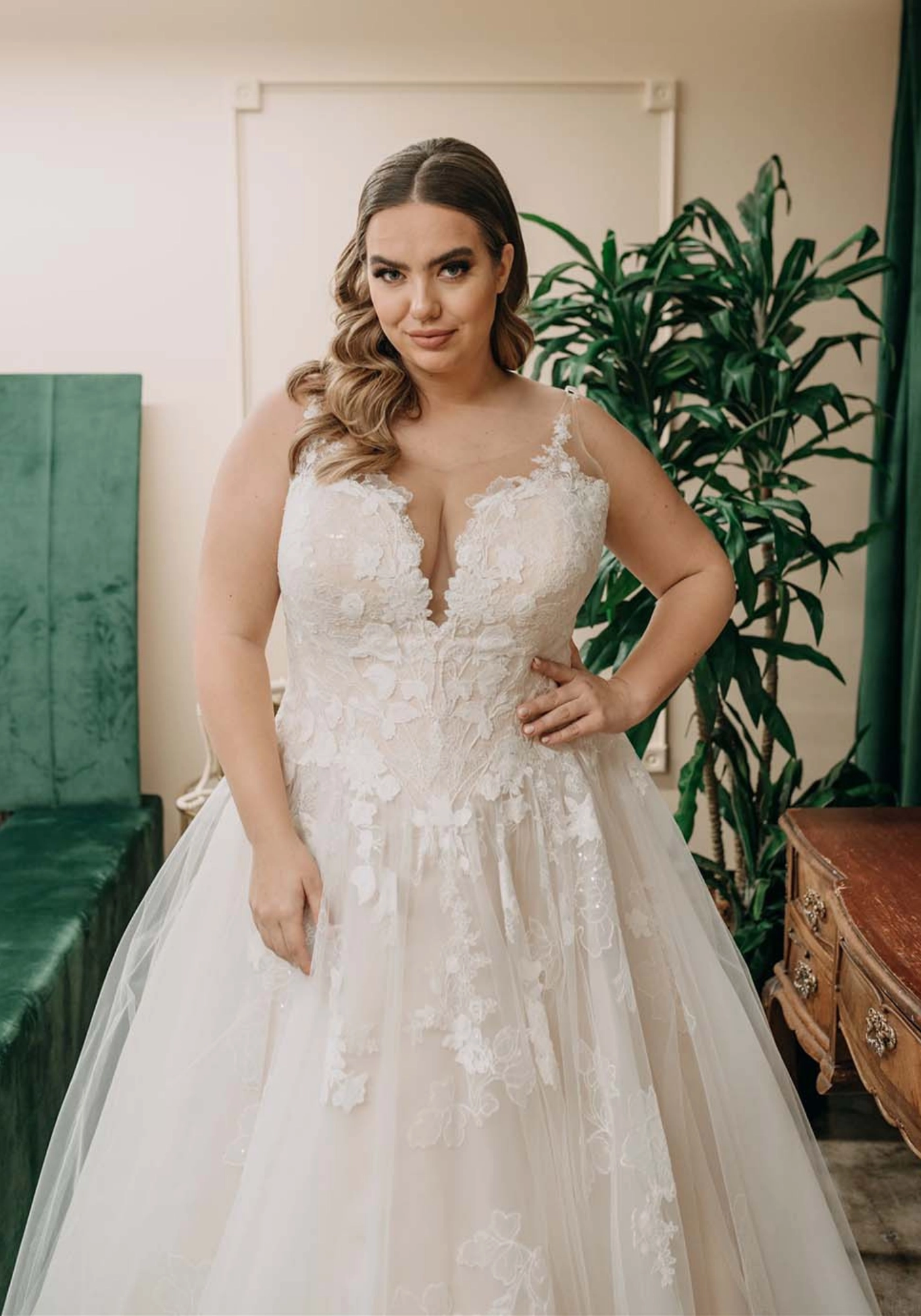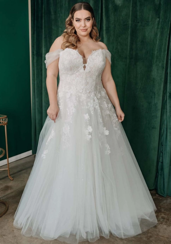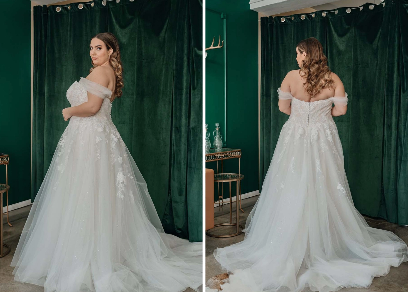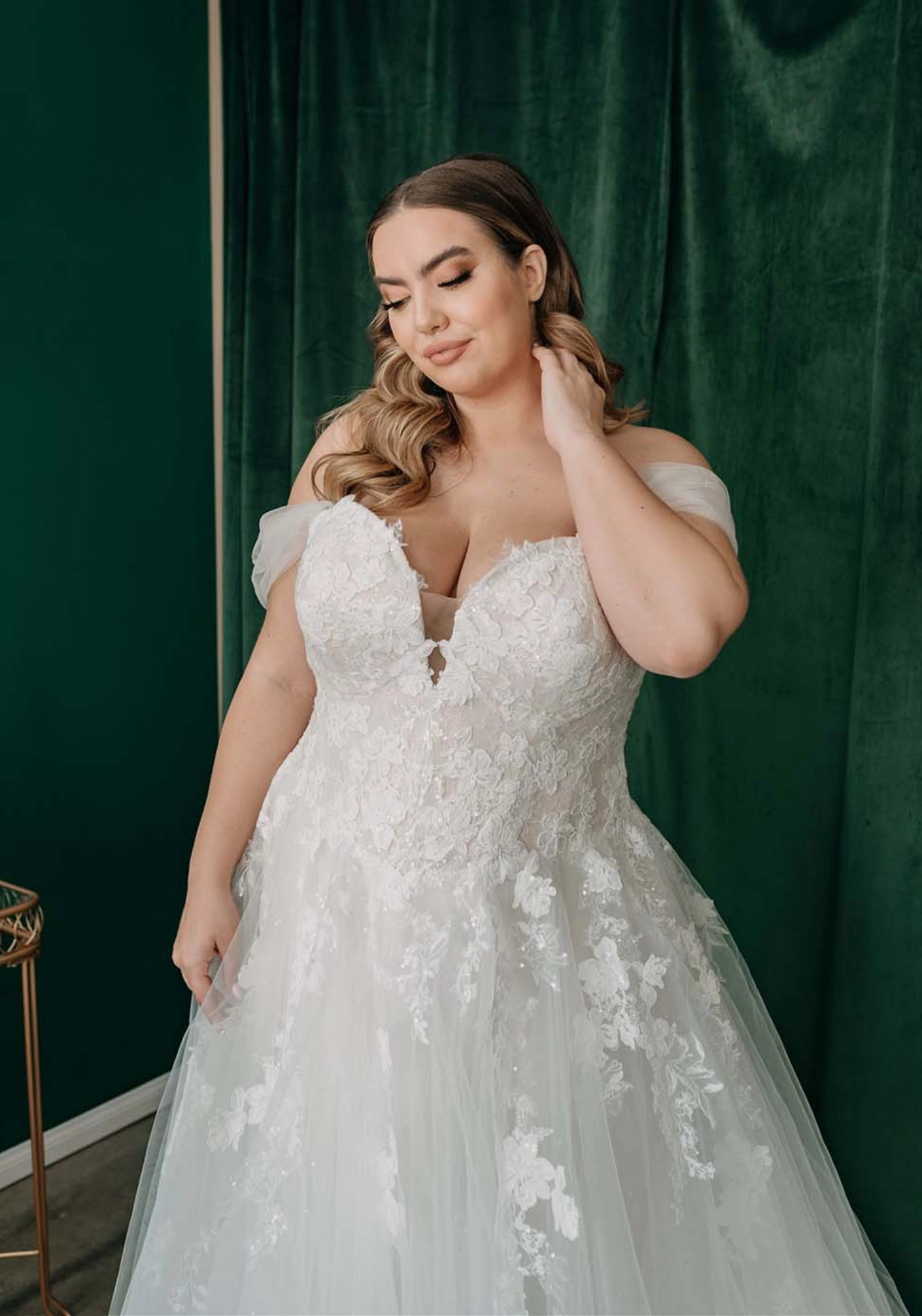 Last but never least... MARGAUX X Édition is the perfect combination of glamour, drama and romance. The figure-flattering lace and delicate off-shoulder sleeves are complemented by the softest flared tulle skirt. MARGAUX X Édition is absolutely breathtaking.