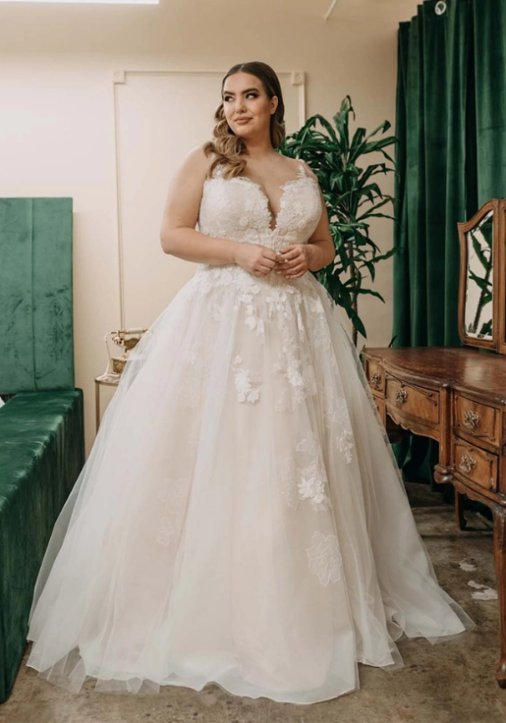 Swooning over the lace bodice of SELENE X Édition! This gown has it all with the delicate lace combined with sleek Mikado fabric to perfectly contour the body, while the flared tulle skirt effortlessly flatters the figure. Her beaded straps provide just the right amount of extra support and sparkle.