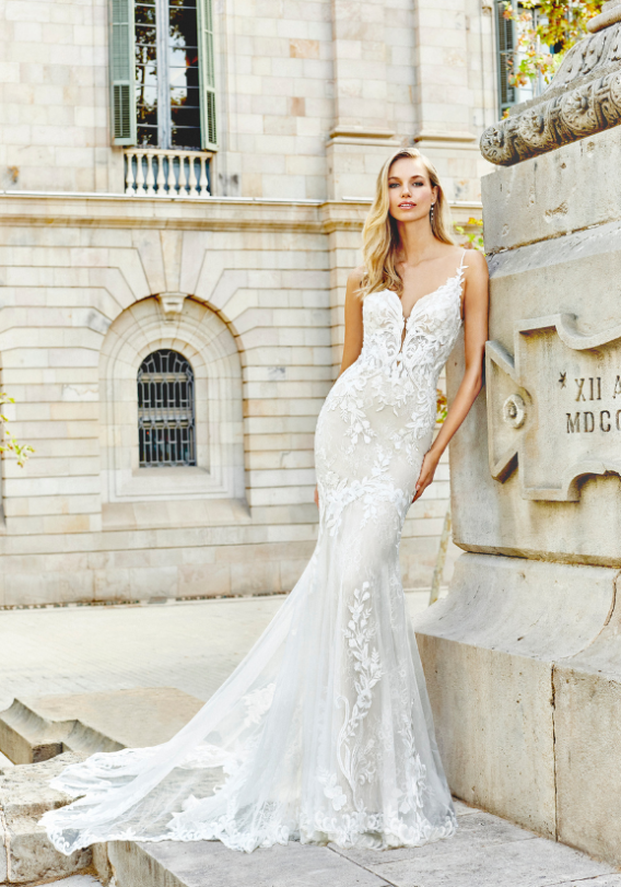 For brides who want a sweet and flirty bridal look, CALIE is the dress you need for your wedding day. CALIE is an all-over lace gown with gorgeous lace designs trailing throughout the bodice and the signature ÉLYSÉE sculpted train.