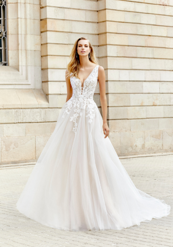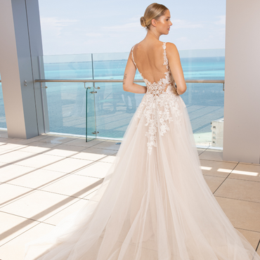 SOLEIL is a super romantic gown with a sweet boho touch. She has a sexy, plunging V-neckline and sparkling floral lace that flows down into the dreamiest tulle skirt.