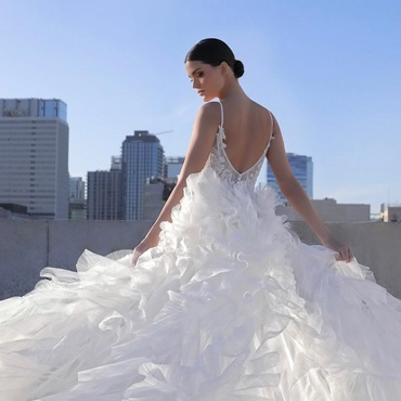 Spring also brings the opportunity to say your "I do’s" outdoors! One thing to consider with an outdoor wedding is the ground. Yep, you read that right – the floor. A delicate light train on grass could get a little dirty or catch on a rough surface. Considering a stronger material like Mikado or organza will ensure your gown will look gorgeous all day and evening.