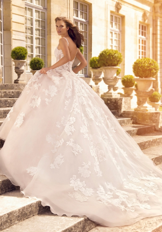 Amandine is a wonderful floral mix of classic and contemporary. Your dream gown doesn’t have to be covered head to toe in floral lace -- this botanical blend cascades down onto the skirt so as the eye scans down, the floral appliques fade into a soft organza and tulle train.