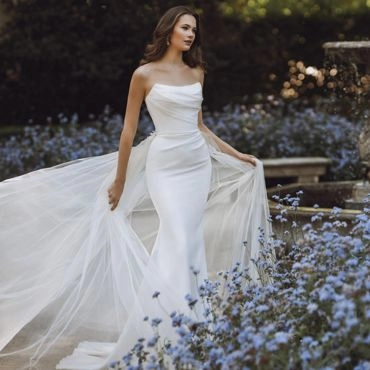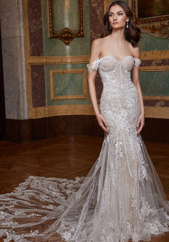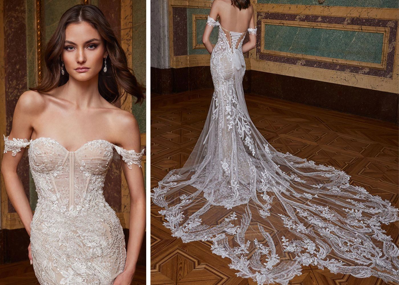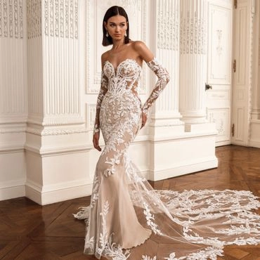 ELOISE presents a marvelous bodice composed of floral embroidered lace, baroque lace, beaded swirl lace, and Chantilly lace with a striking tulle corset back that adds a touch of drama and softness, ensuring a flattering and customizable fit.