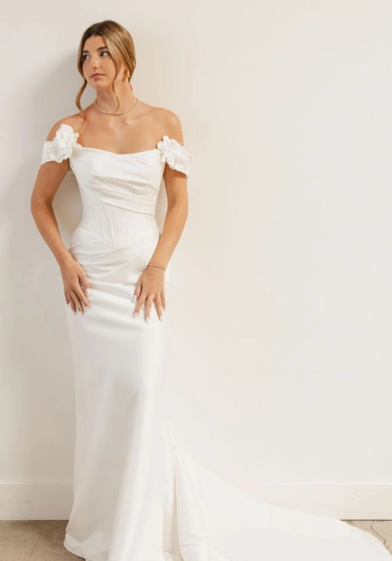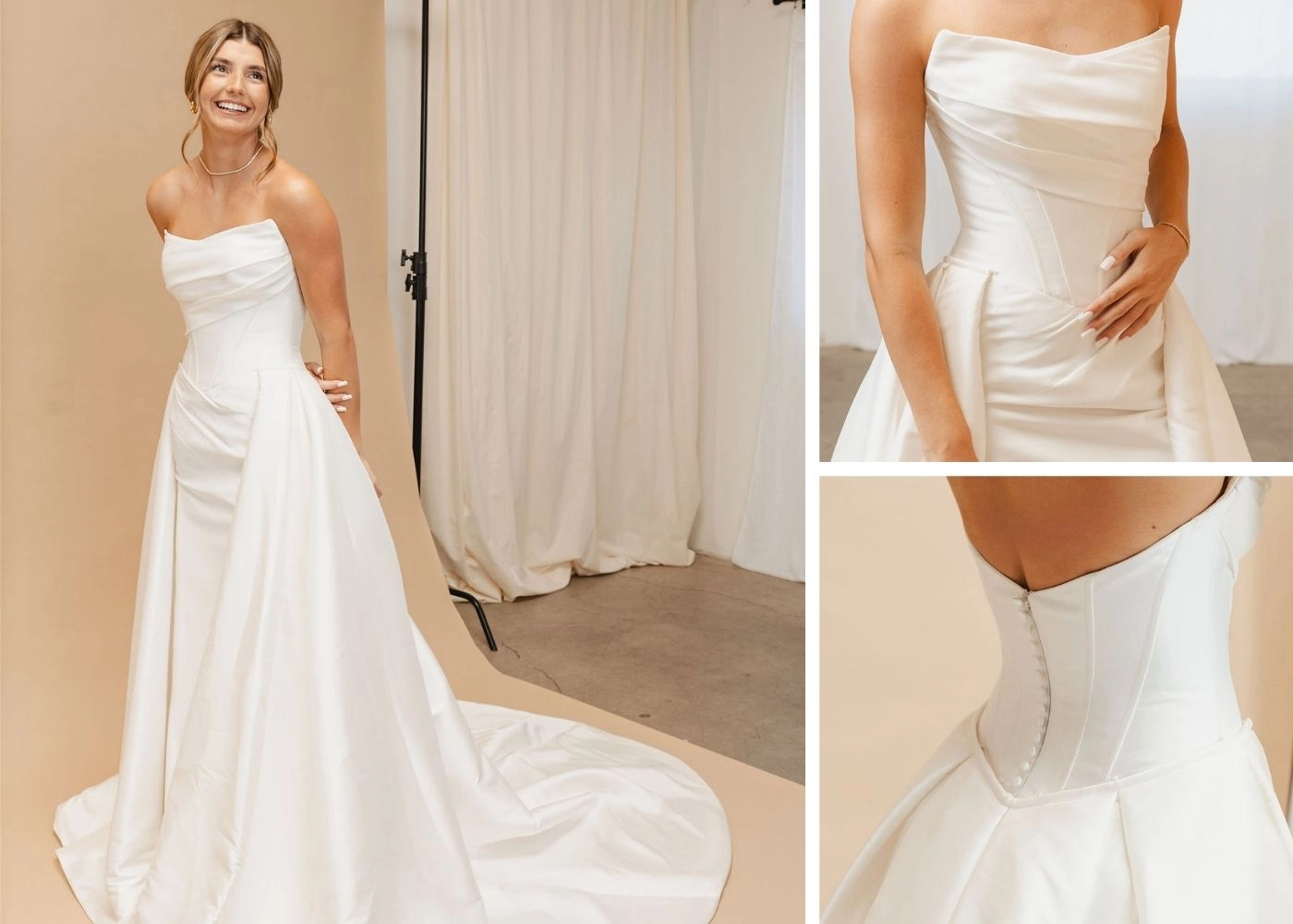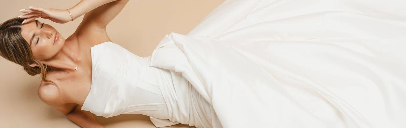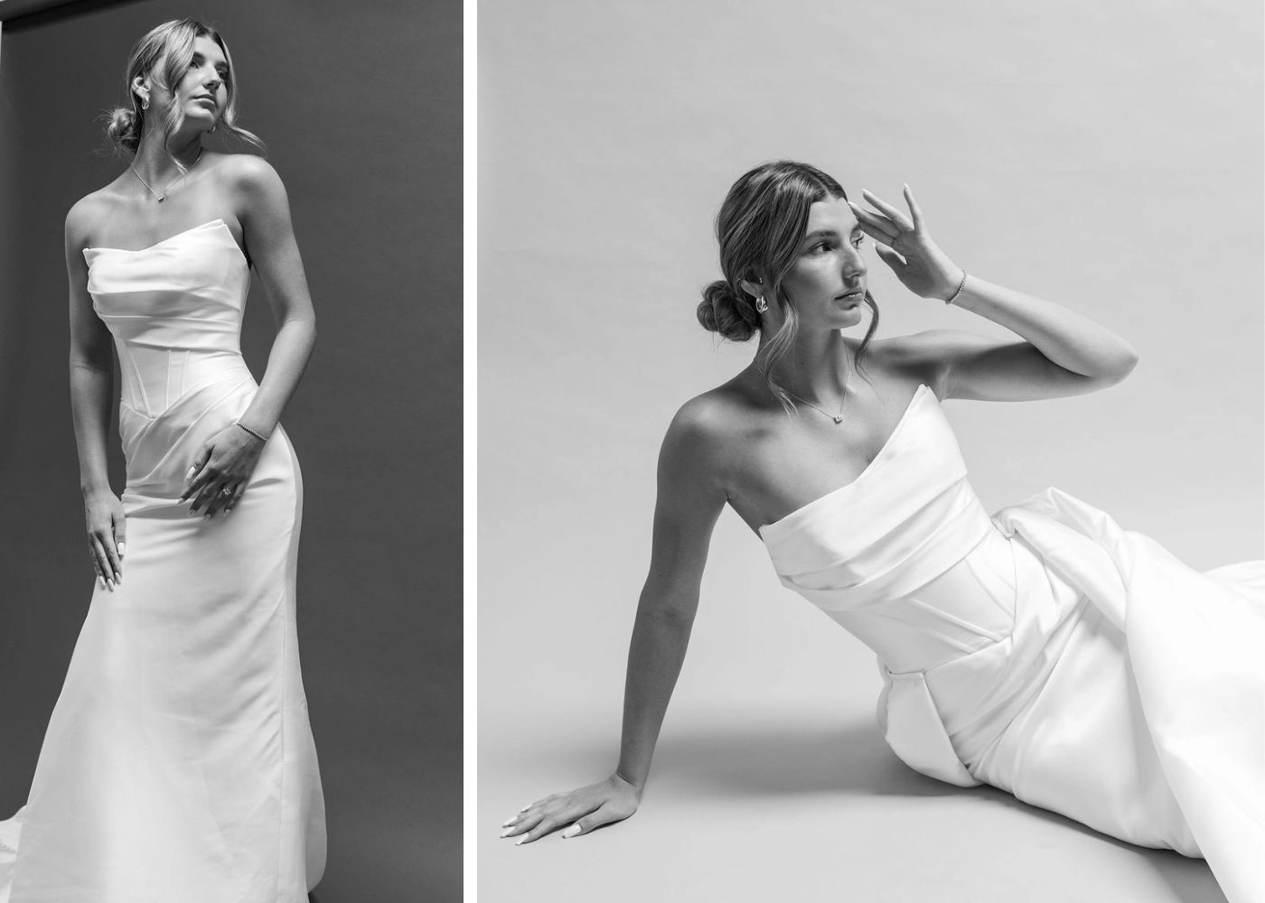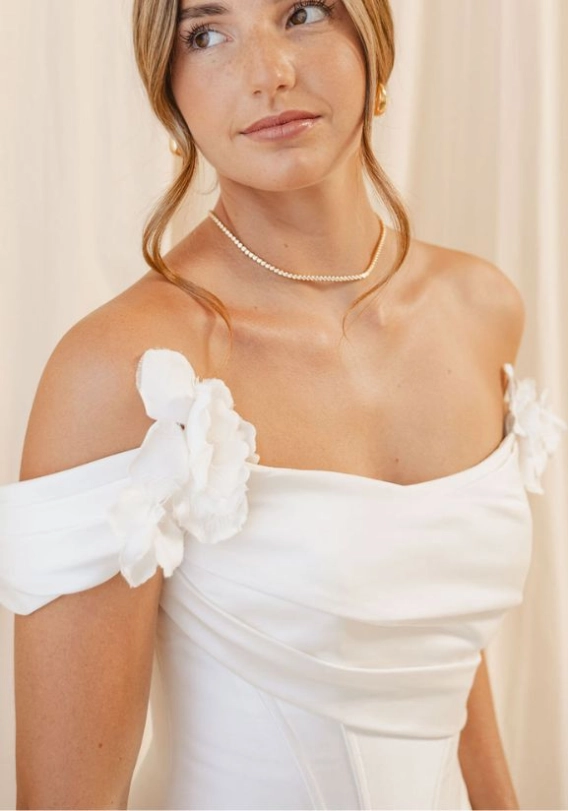 At first glance, FLORENTINA stuns with its clean, elegant silhouette. But look closer, and you’ll find thoughtful details that set it apart — starting with the artfully draped bodice featuring exposed corset boning. This sculpted detail offers both a flattering fit and refined structure, creating a sleek, contoured shape that supports and enhances.