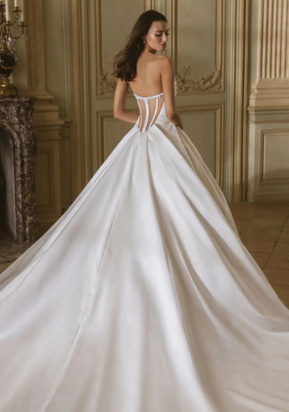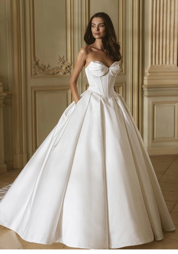 The gown’s sweetheart neckline shapes the décolleté with softness and grace, creating one of the most flattering lines in bridal design.