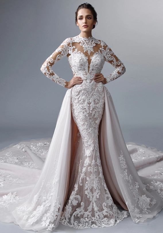 A plunging neckline isn’t for every bride on her wedding day. A high-neck gown brings new exciting options for brides looking for a stunning and sophisticated look, as well as being oh-so flattering. The Koh-I-Noor necklace is attached with elegant button detailing and blends seamlessly into the gown, transforming the modern classic into a sophisticated, glamorous second look. Perfect for the ceremony and with the option to remove it for a little more movement at the reception.