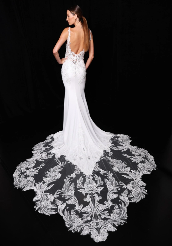 Starting off with a sleek and sparkly look... AZZURRA! She is a stunning stretch georgette gown with an intricate lace bodice that is sure to sparkle and stun as you walk down the aisle.