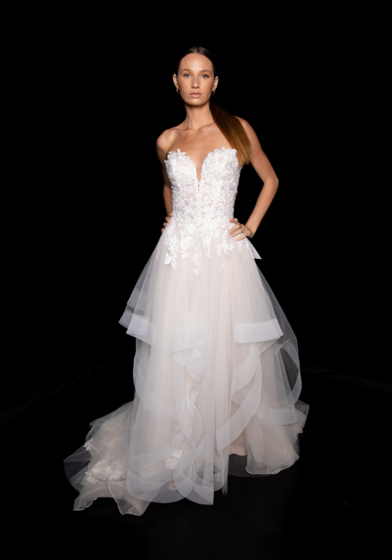 Looking for a unique, fun and flirty wedding dress? AVRIL is the one for you! Her ruffled skirt brings such a youthful and playful flair to a classic A-line bridal silhouette. This is the perfect gown for giving extra shimmer and sparkle as you dance the night away!