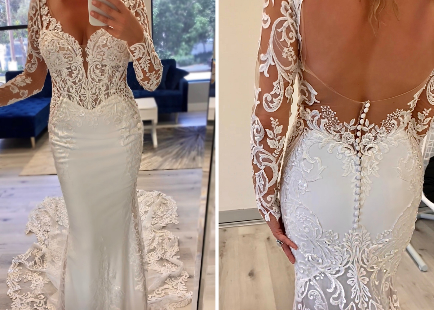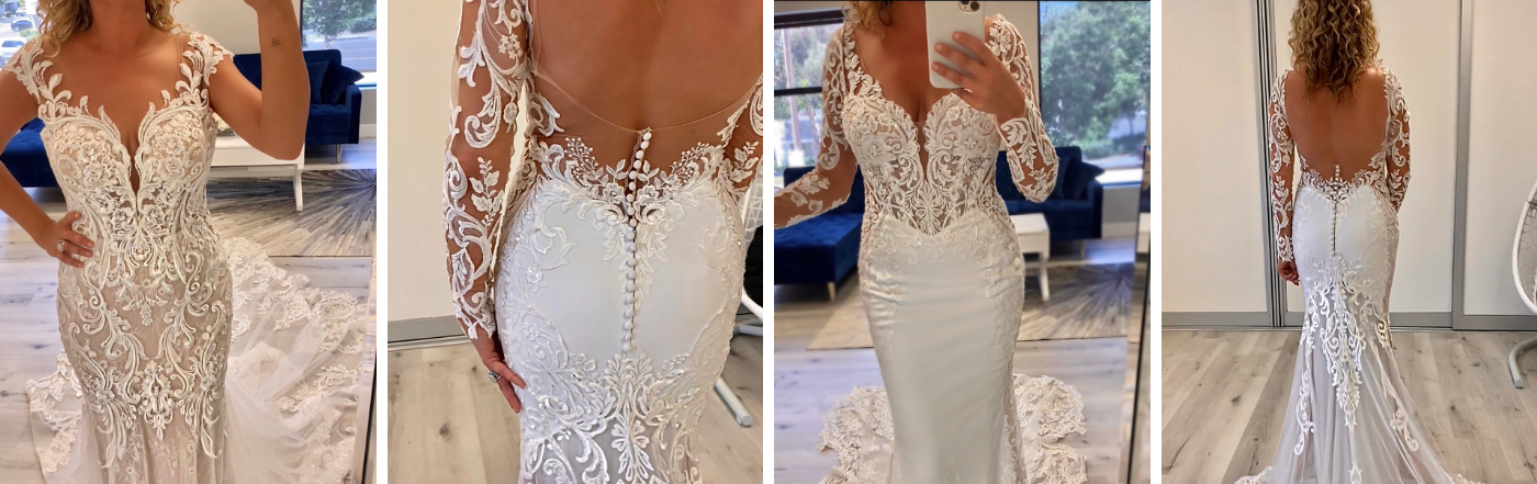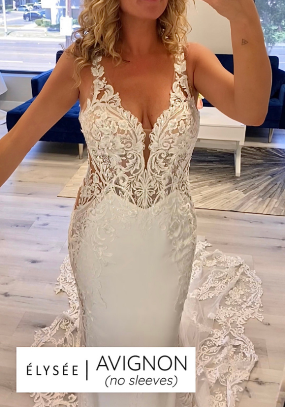 "Could I look any classier right now? This beauty is AVIGNON and she just... she has everything going on right now. Check out this insanely gorgeous lace detail, we have a little bit of a shimmery, sparkle type of deal going on here, just leading down into that stretch georgette. My favorite piece of the style is actually these really low cut-outs. I’m more of a cereal-box-variety type of body shape so this kind of cut is really just gonna cinch you in and give you that hourglass look, paired with a seam at the waist that's a little bit pointed. Amazing design. Absolutely adore it. And this style has a surprise. Let’s see what she’s got. Surprise! The sleeves are removable. Can you believe, they actually snap all the way around the edges of these straps? Flawless! Nobody will ever know that your straps were detachable. Absolutely love the versatility of looks like that where you can get married and do your ceremony with a really romantic long sleeve and then just rage in your reception. I’m sure you can even rip them off just right then and there because it just snaps. People will think you’re hardcore, but absolutely love two different looks. Obviously the core foundation things that make it so beautiful are still there, but it just is a totally different aesthetic and style so you can do one if you prefer the sleeveless, you can do the sleeves all night, or you can switch it up. You can be a chameleon. Love it! AVIGNON"