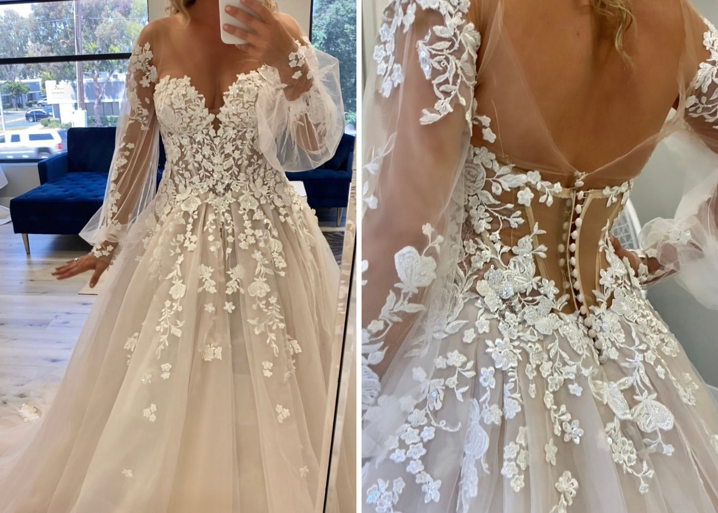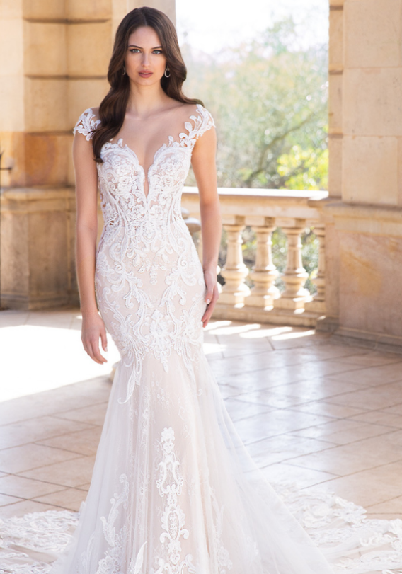 "This is ÉLYSÉE’s ANDREA. What. So pretty. So classically beautiful. The front is just gorgeous, you have this illusion mesh which just holds everything in. It helps to create this off-the-shoulder look so you have full mobility and can move around, but this dress is absolutely stunning. I don't know if I like the front or the back better. Wait 'til you see the back of this style. ANDREA. Serving up looks. Gorgeous!"