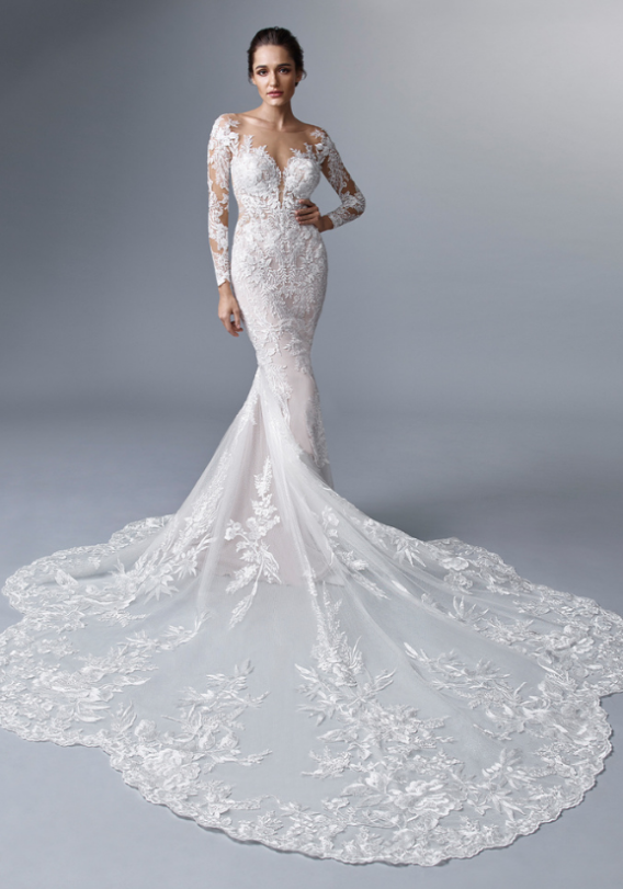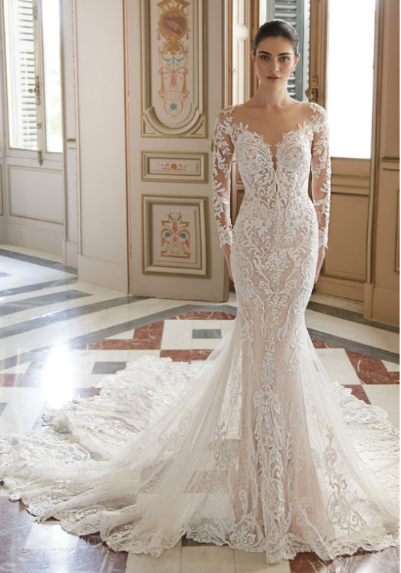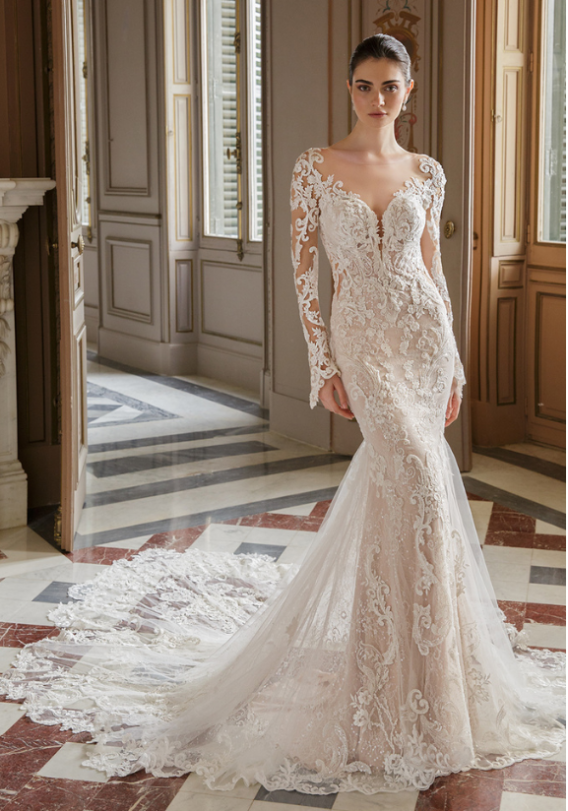 Next is our super glamorous LOUVECIENNES gown! She has an illusion sweetheart neckline for a super romantic, classic look that perfectly balances sexiness and coverage (for the cold, of course!). Her delicate, long illusion lace sleeves are perfect for creating that timeless bridal style... and providing some extra warmth!