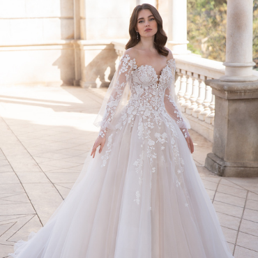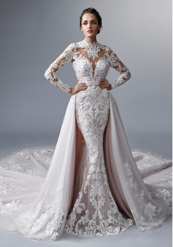 LOUVRE oozes regal sophistication with her plunging sweetheart neckline, long lace sleeves with fashion-forward extended cuffs, and a voluminous, detachable A-line overskirt. Guaranteed to bring the WOW factor!