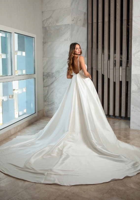 For all our brides-to-be looking for a minimalist yet dramatic gown for the big day... it doesn't get better than VERSAILLES! She is a glamorous, full Mikado ball gown with pockets and a sexy high slit for a super flirty look. VERSAILLES also features a stunning detachable Mikado train that will have everyone's jaws dropping!