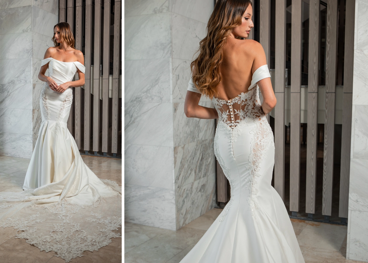 A sleek, chic Mikado gown... LARA is bringing all the heat with her sexy illusion side cut-outs and stunning lace train! It's minimalism meets glamour at its finest!