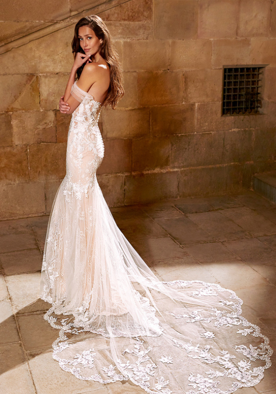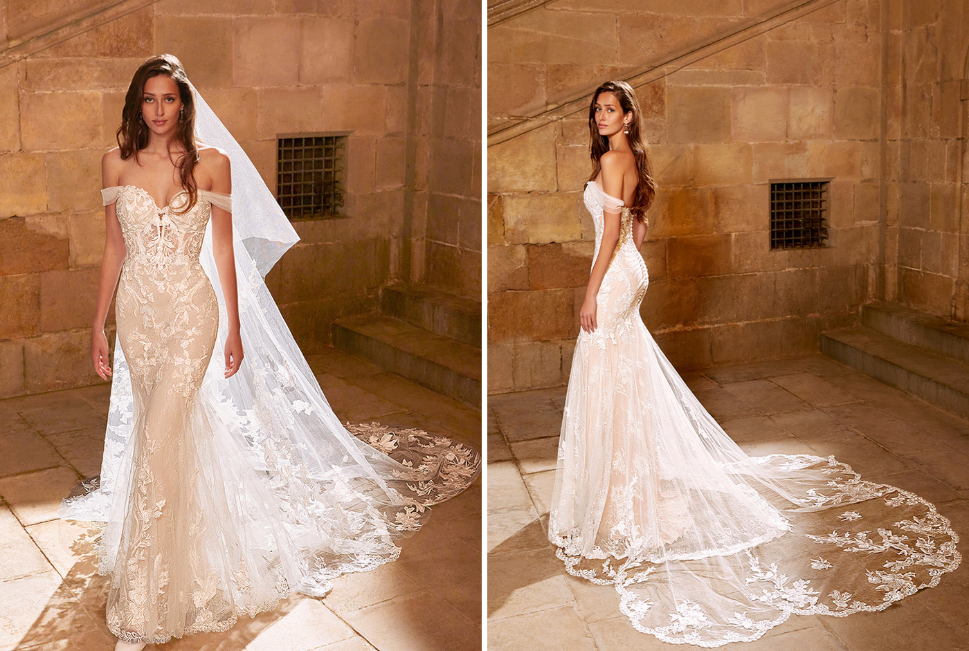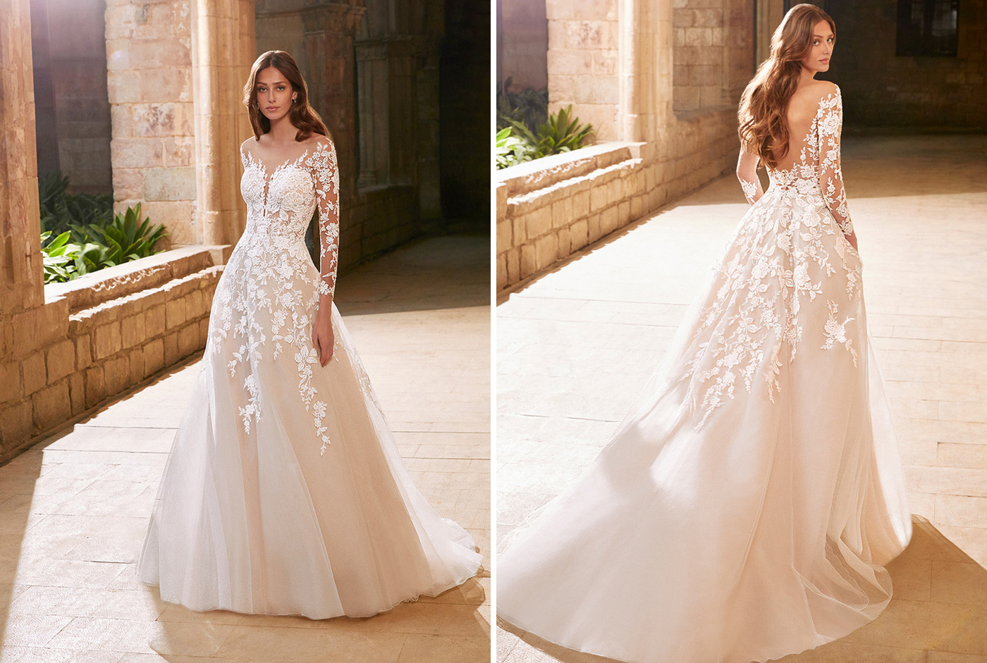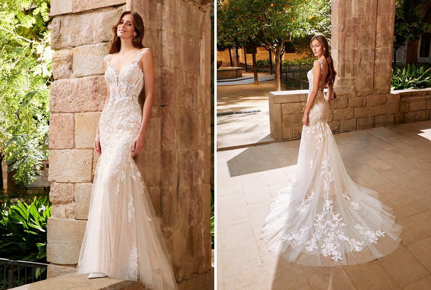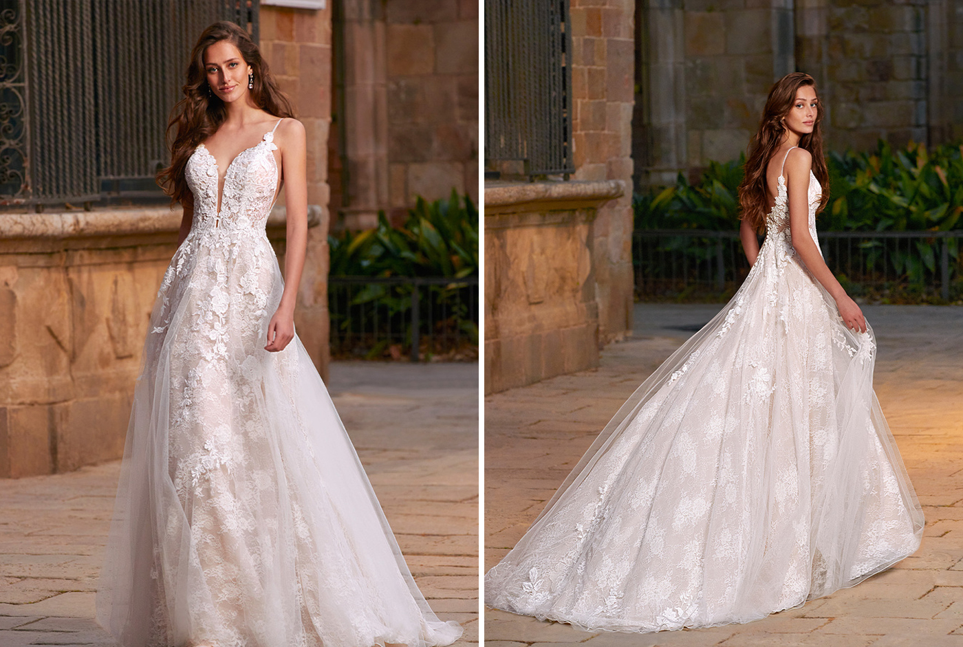 Wow, wow, wow! This magical Spanish courtyard is giving us major Bridgerton vibes! What a romantic backdrop to let the gorgeous 2021 ÉTOILE collection shine -- and they did just that. The intricate lace used in this collection is mesmerizing and beautifully emphasized against the stone backdrop. We are so excited for you to scroll through these images and get some inspo for your dream day…