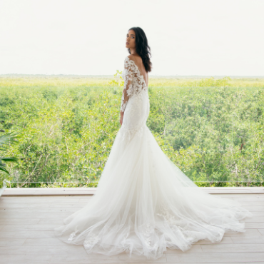 It's no wonder EVANGELINE is a favorite, designers' choice gown. Add a romantic touch to this sweet and sexy look with detachable off-shoulder sleeves -- the perfect feature that will take you effortlessly from day to night!