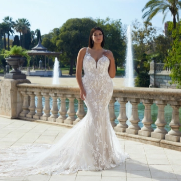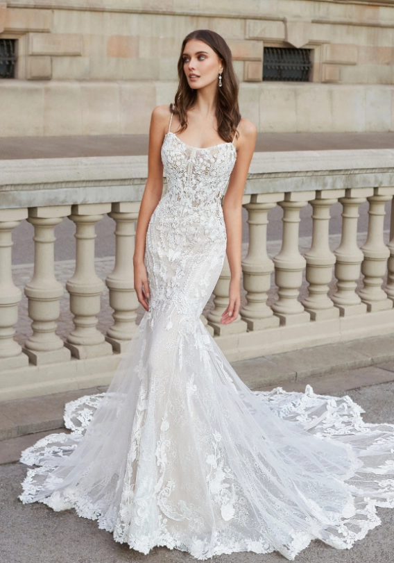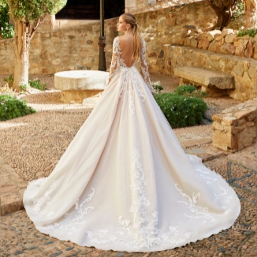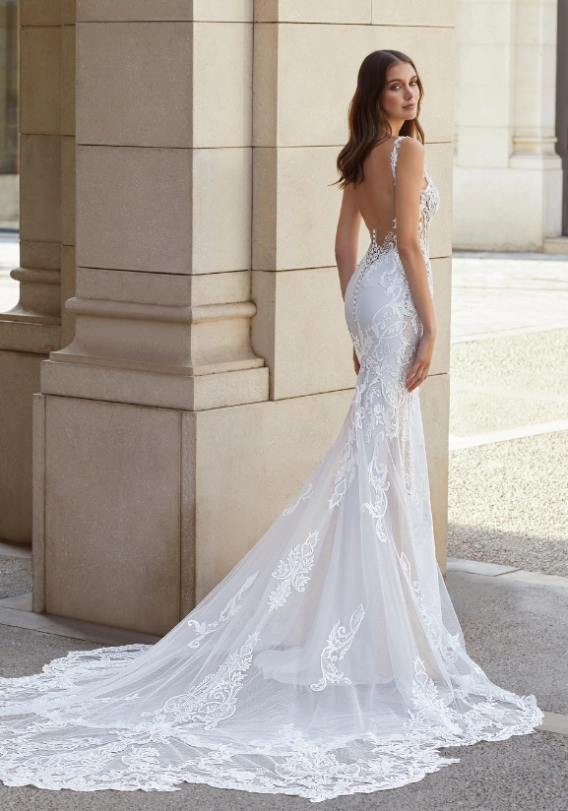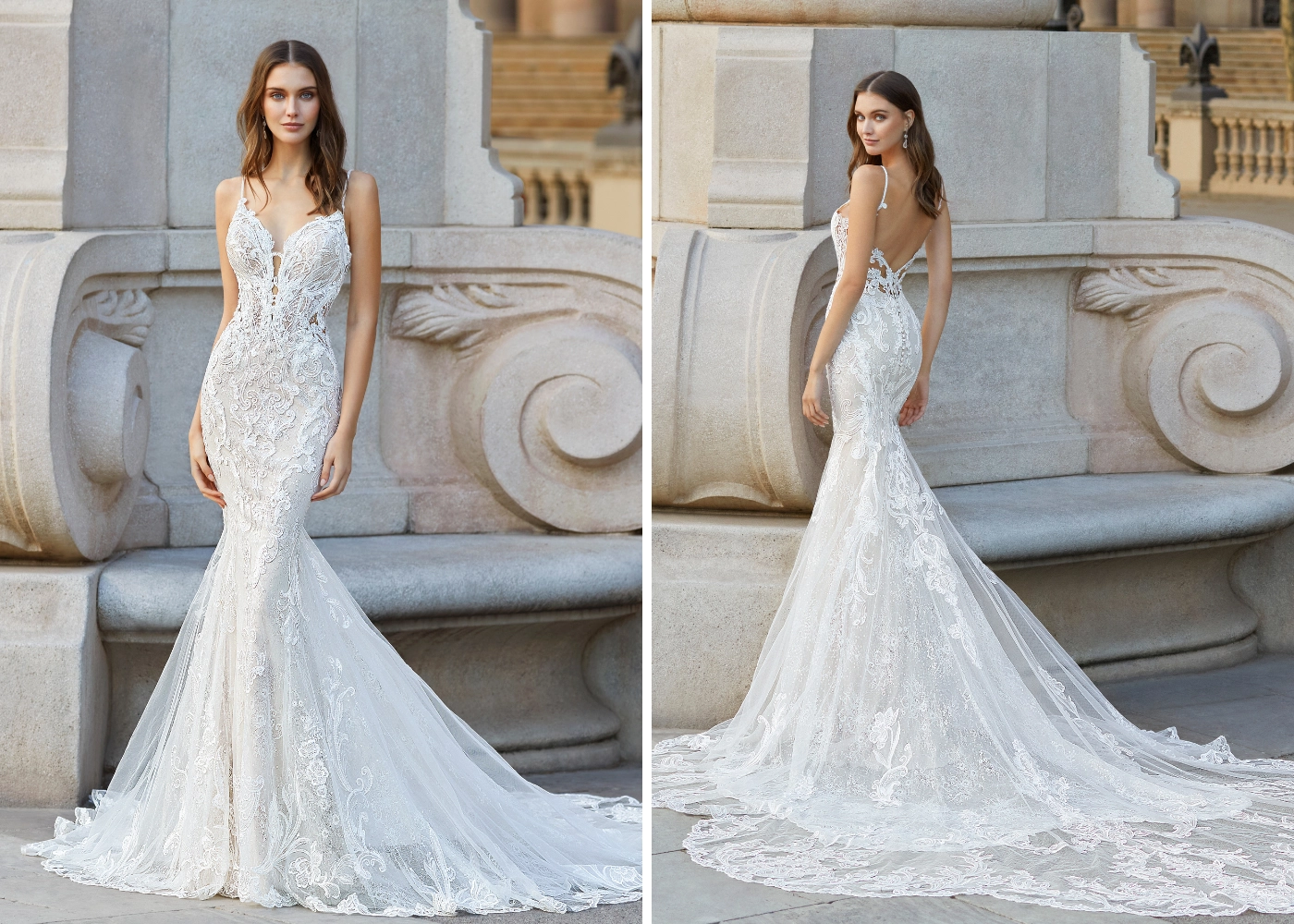 SIBYLLA is so unique and different that you won't be able to find a gown just like it anywhere else. Her unique curved neckline, floral and linear lace detailing, the open corset back, the double sculpted hem train... What more could we want in a gown?