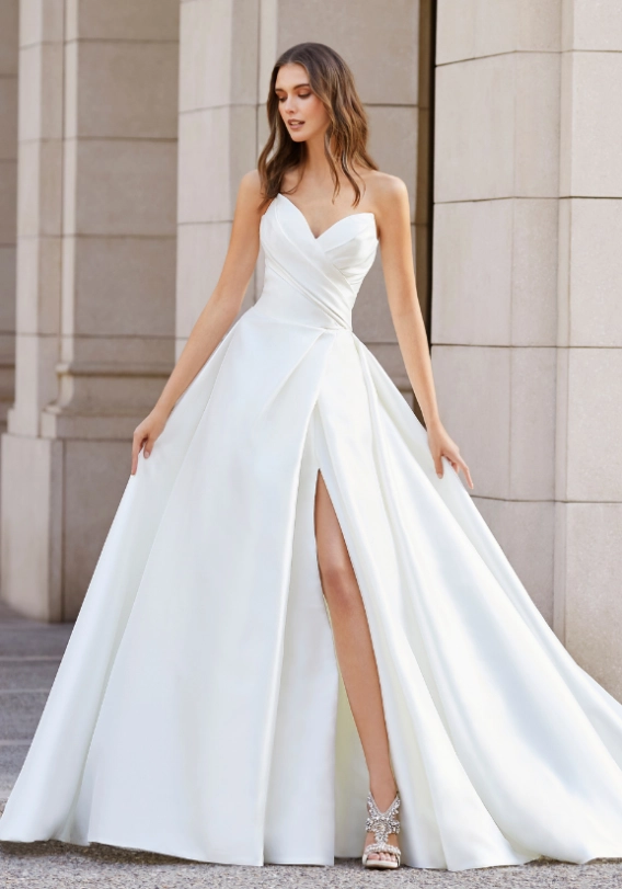 Any bride will be living their princess moment in DELANCEY. She is a classic, clean ball gown with a figure-flattering draped bodice and a high slit. A perfect gown for that picture-perfect, modern princess vibe.