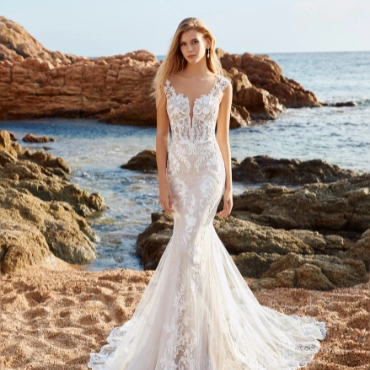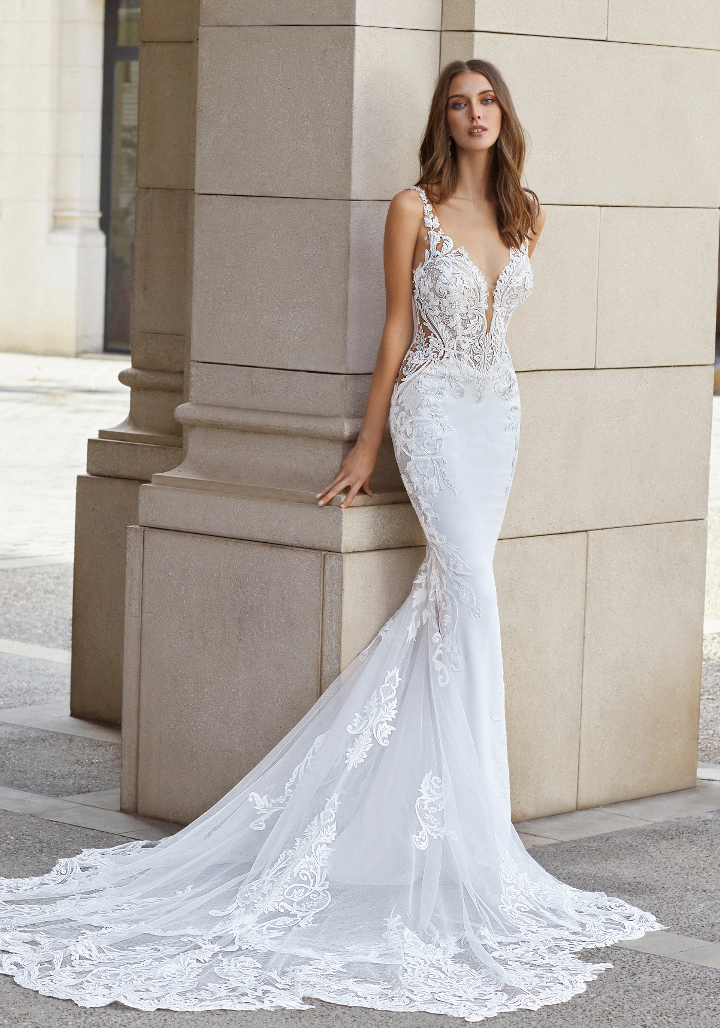 AVIGNON is a beautiful mermaid wedding dress guaranteed to turn heads. Her alluring V-neckline and body-contouring silhouette are just two of the many reasons we love AVIGNON. And the cherry on top? She is also a 2-in-1 look with removable, detachable long sleeves!