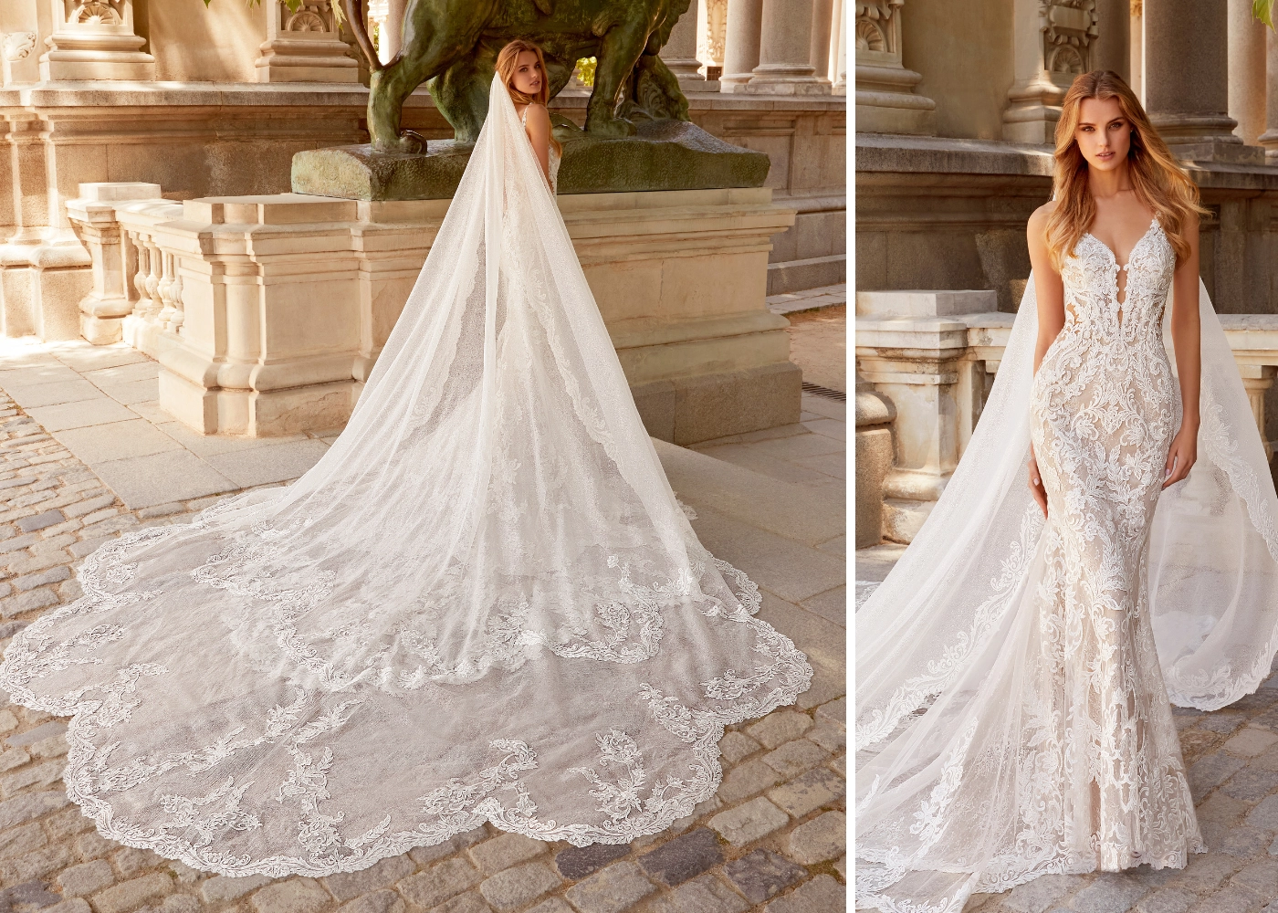 Next up is 2023 ÉLYSÉE Atelier bringing all the glamour and then some! This year's collection features all-new intricate lace designs and stunning double sculpted trains on classic A-line, ball gown and mermaid silhouettes. Detachable overskirts provide effortlessly versatile styling options... and check out the gorgeous gown below with a matching veil for the most ultra-romantic look.