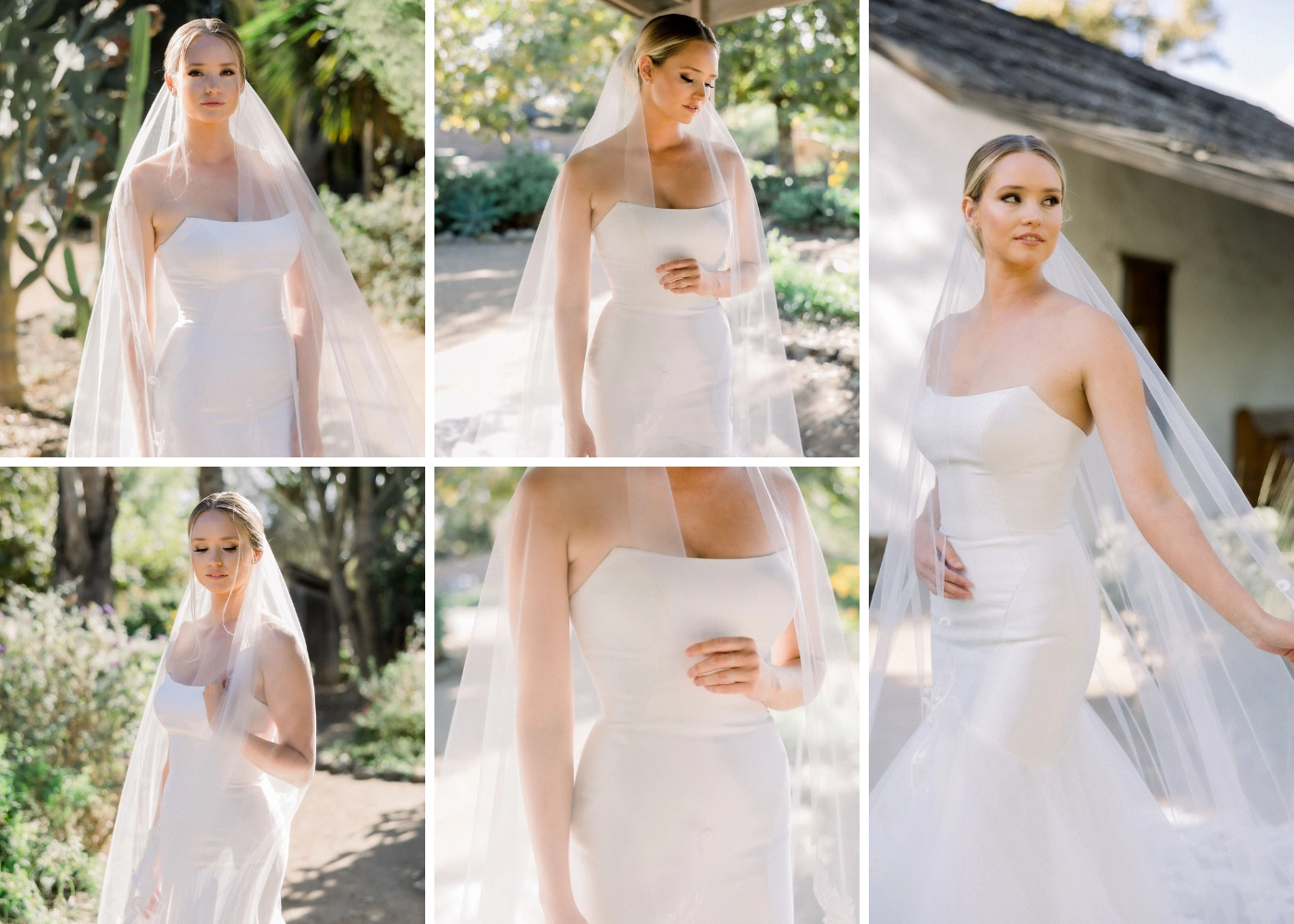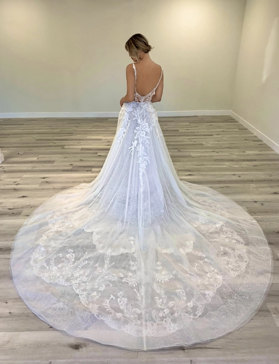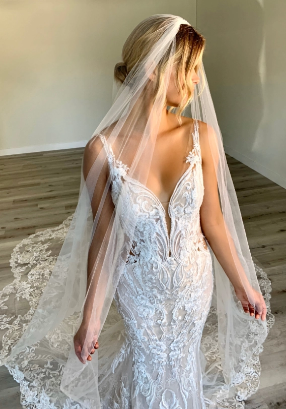 How about our EVANGELINE wedding dress shown here with our SABINE veil? Check out that breathtaking triple-sculpted hem train!