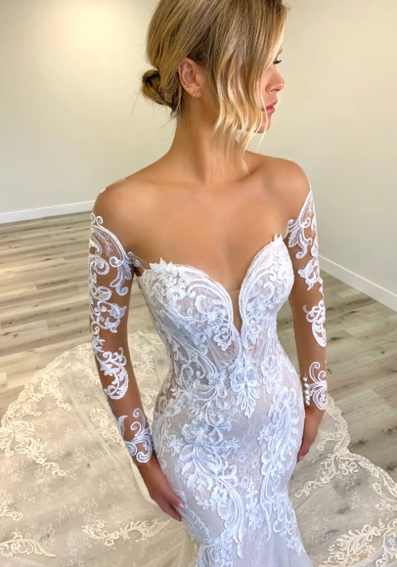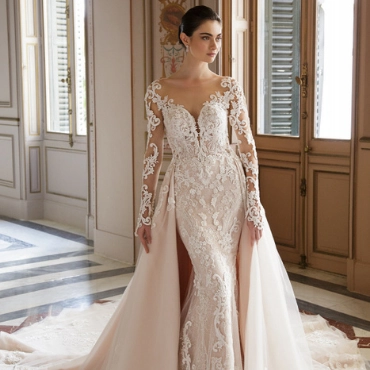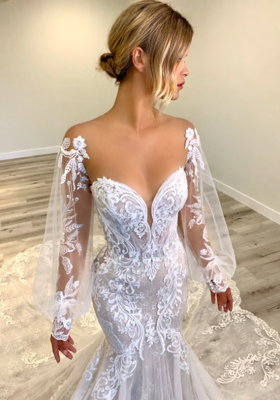 The detachable, long CLAUDINE sleeves are perfect for brides who love dreamy, swirling lace. Adding sleeves is a great option for colder weather weddings -- and provides an easy way for you to enchant your wedding guests with two different bridal looks on the big day!