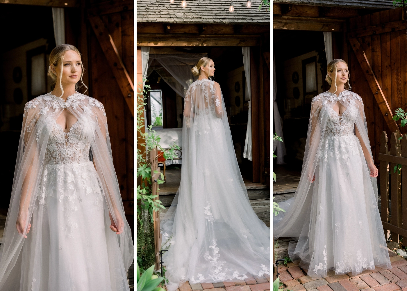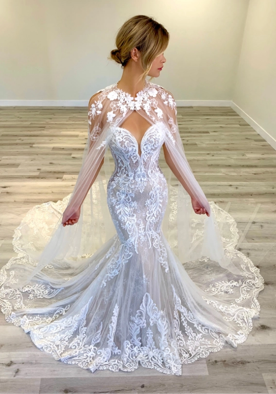 If a wedding veil isn't your cup of tea when it comes to your dream bridal style but you're still on the hunt for something romantic and dramatic, a cape could be a great alternative option. The VIVIENNE cape brings just the right amount of drama like a veil would, and looks chicly modern paired with any style of gown, such as an A-line wedding dress like PENELOPE (pictured above) or a mermaid wedding dress like ATHÉNAÏS (pictured left).