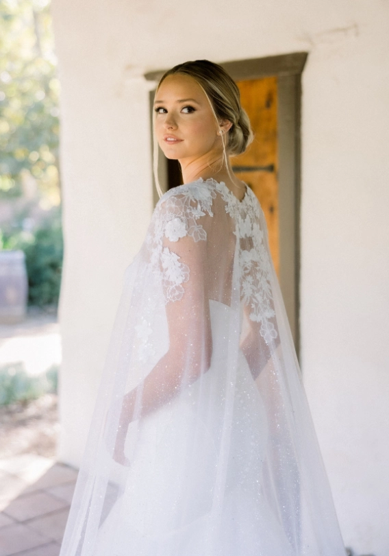It's all about the lace and shimmer with our ROSELYN cape. The ROSELYN cape is an all-over sparkling cape with a romantic floral lace design on the shoulders. Similar to a removable jacket, this cape comfortably sits right on the shoulders without falling. The cape goes well with a super swirly lace gown like FRANÇOISE or a sleek Mikado gown like GIGI.