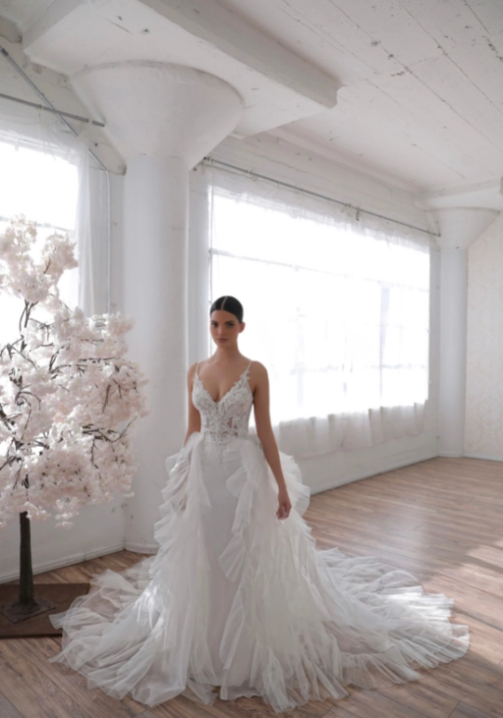 The detachable DELPHINE skirt is a beautiful ruffled overskirt that you can wear atop your dream dress for added elegance -- guaranteed to be a show-stopper!