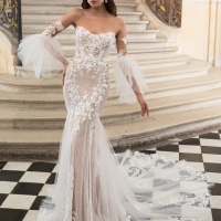 This dazzling mermaid gown with a stunning curved neckline and beautiful tulle ribbon corset back has given us all the romantic wedding day butterflies. ARWEN features floral baroque lace from the bod