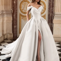 This ultra-fairytale gown is a timeless Mikado ball gown with an exquisite draped bodice and a sexy high slit for a super flattering look. The 3D floral appliques on the off-shoulder sleeves add extra