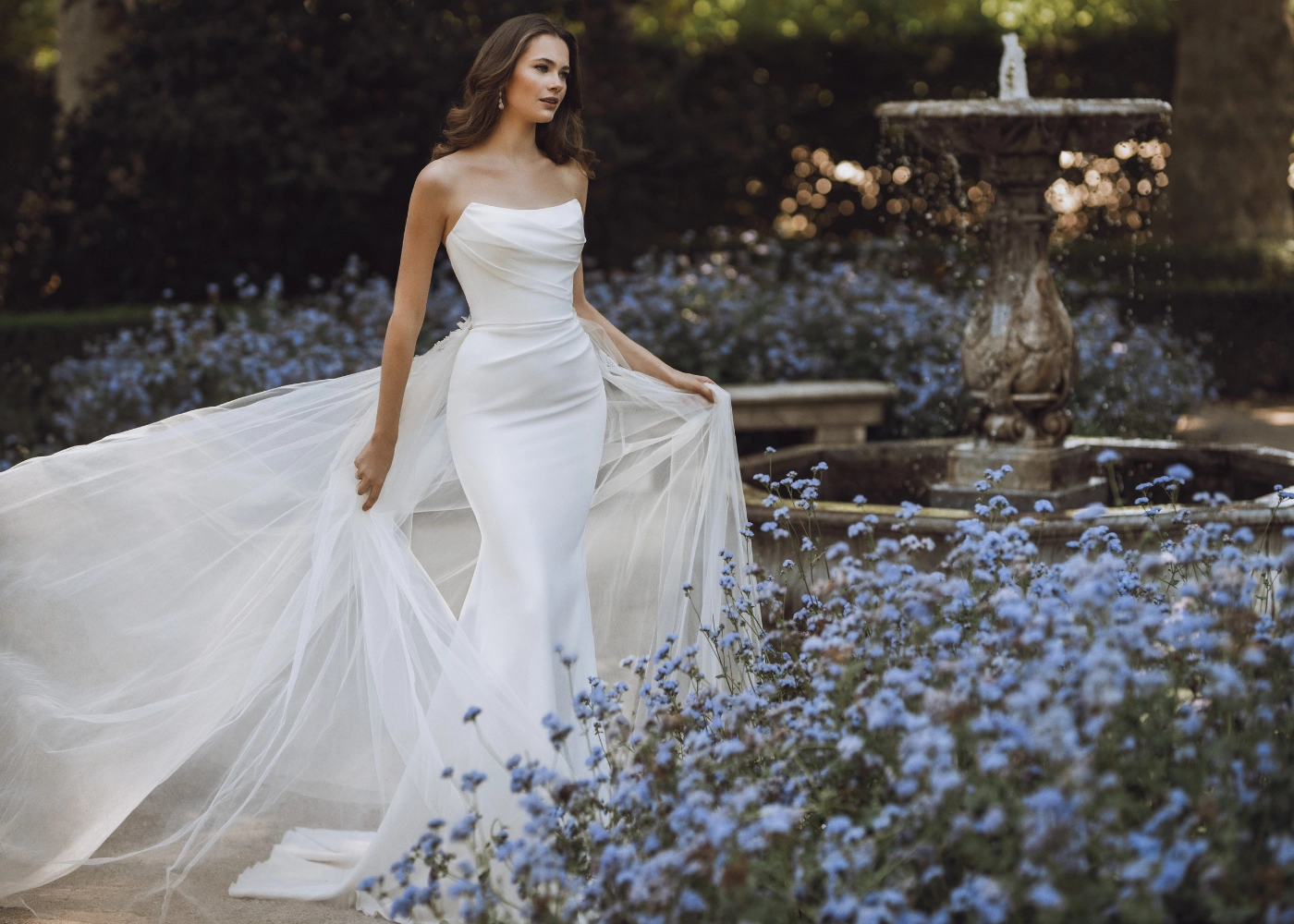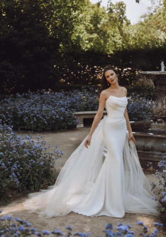 Discover the allure of ESMARIE! A minimalist mermaid gown with a fun and flirty detachable overskirt to elevate this stunning bridal look, this dress is the perfect blend of modern elegance and soft romance.