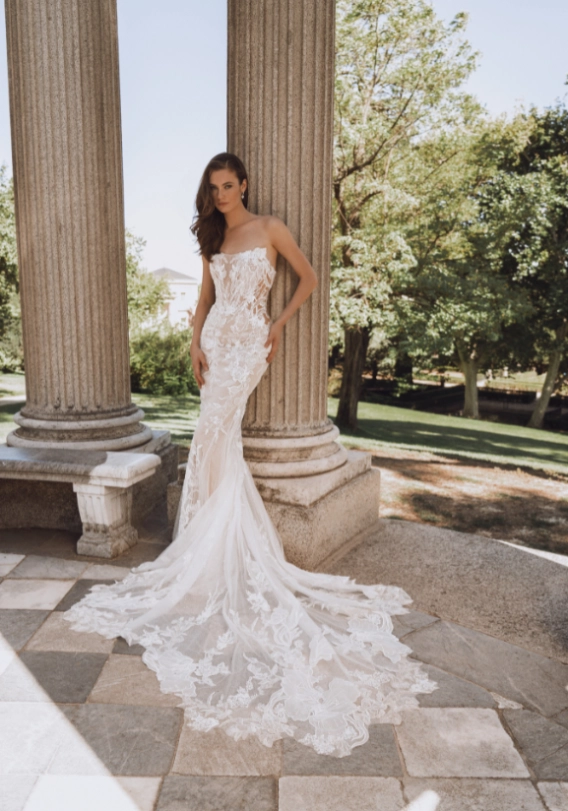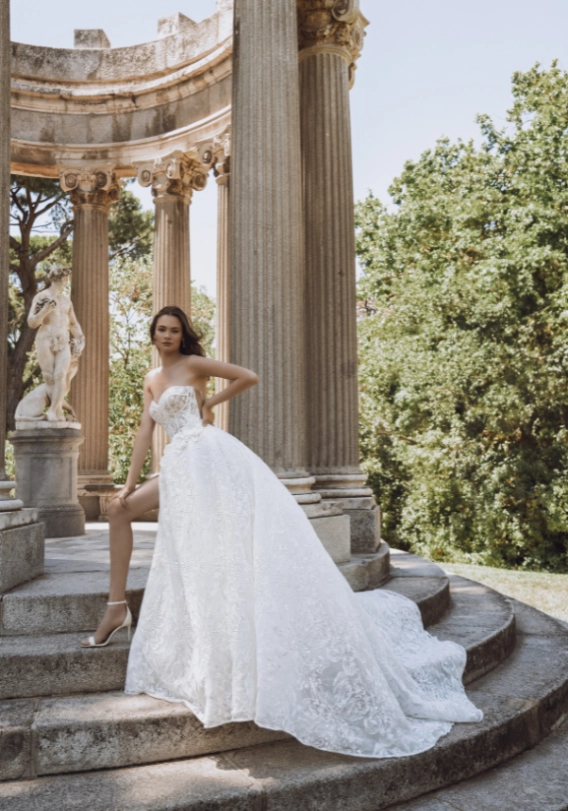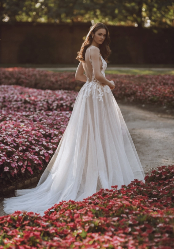 ELORA is a stunning fusion of classic elegance and modern flair. Her detailed lace and shimmering sequins perfectly fit the enchanting garden wedding vibe.