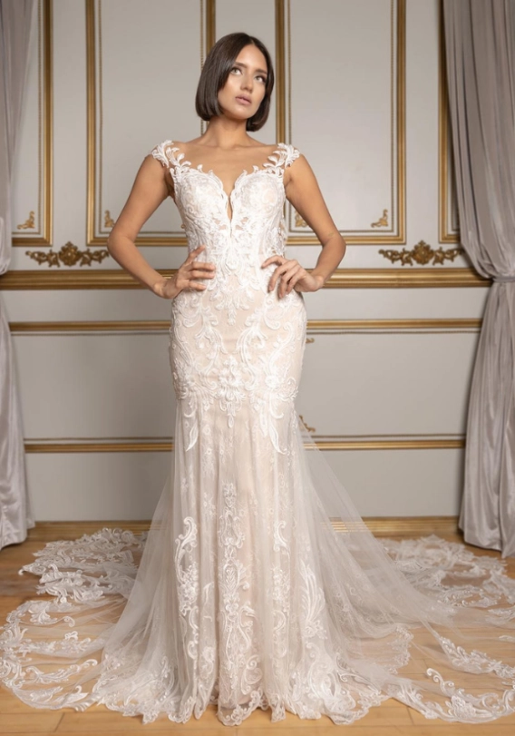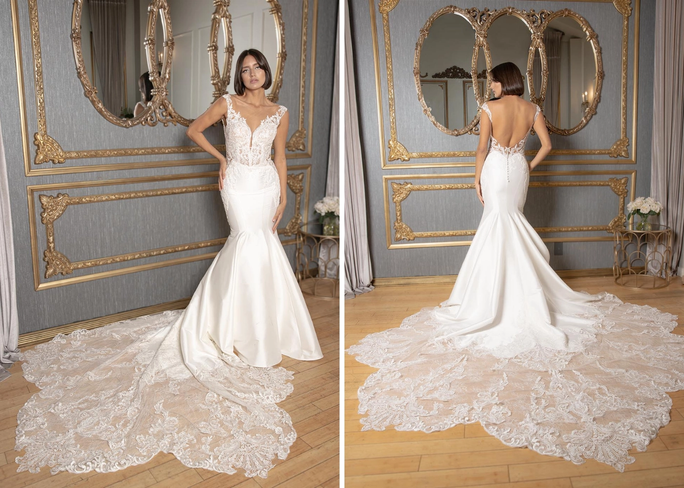 ANDREA screams ÉLYSÉE bridal glamour! She has the stunning illusion plunging neckline and beautiful baroque lace that cascades down to our beloved signature double-sculpted train.