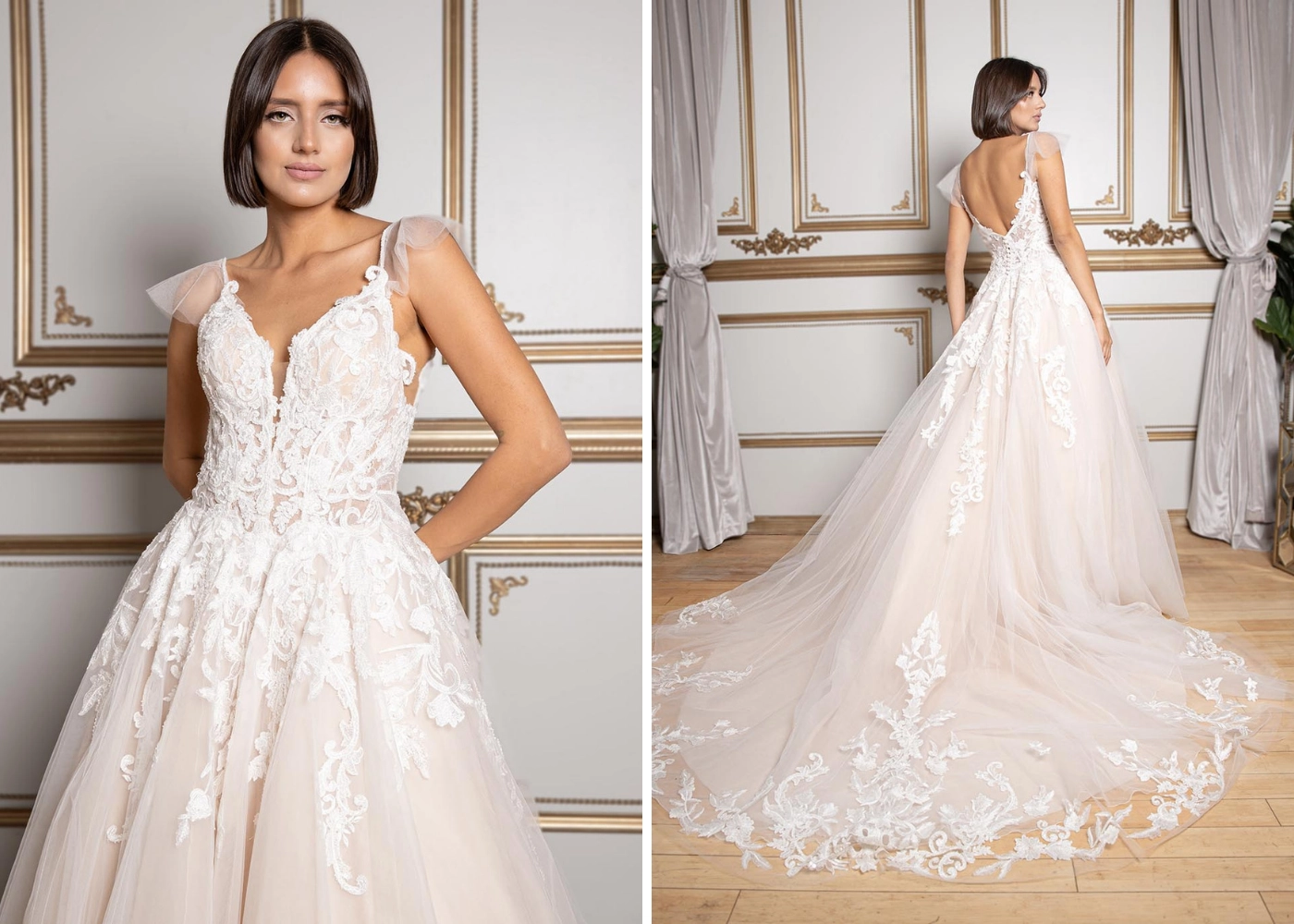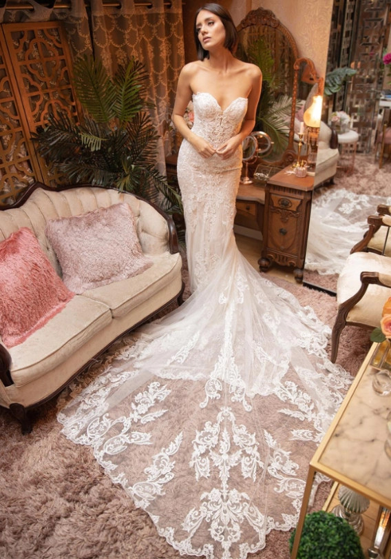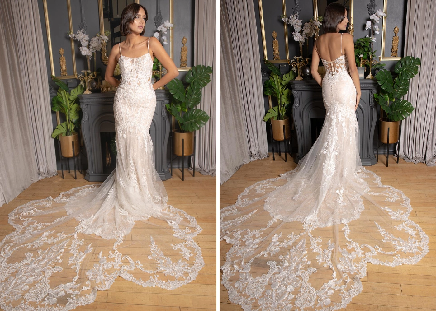 Starting off with our gorgeous SIBYLLA! Her unique floral and linear lace is something that we have not seen before. She has a stunning open, illusion back that cascades down to a beautiful signature double-sculpted train.
