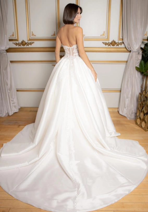 Imagine wearing ORLEANE in a fairytale land! This regal ballgown wedding dress will make you feel like you stepped straight out of a storybook with her voluminous yet lightweight Mikado skirt and sweet lace trickling down from her sweetheart bodice.