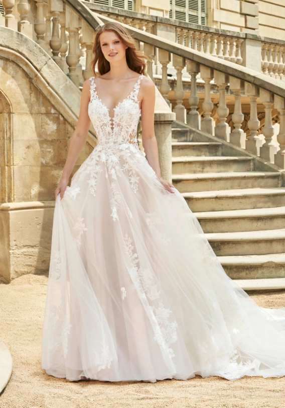 INÉS is the definition of fairytale romance. Her floral lace cascading down from the waist-cinching bodice to her soft, ethereal skirt is what makes this gown perfect for brides searching for that sweet princess style in real life!