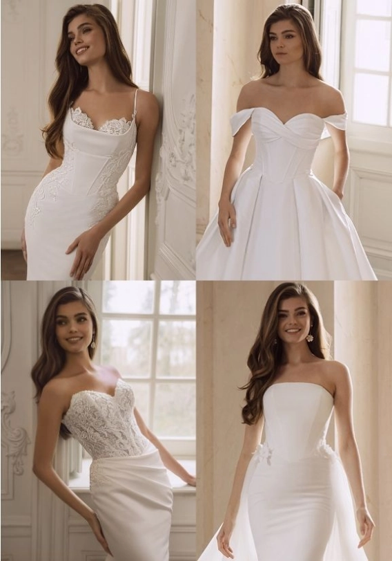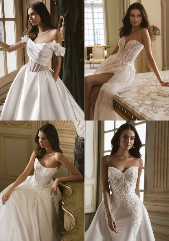 Stand out gowns include: GALA that commands attention with a cascading overskirt and deliately placed lace appliques and GENEVA which offers sleek minimalism in structured satin, with a corset-style bodice for clean sophistication.