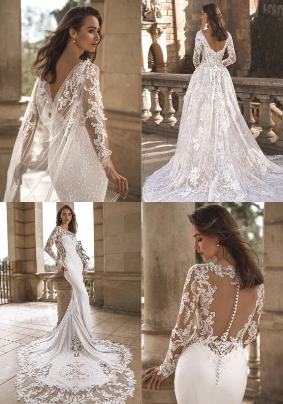 And we can't forget FELICIA, a crepe beauty with an ornate lace train and illusion back adorned with buttons and lace appliques.