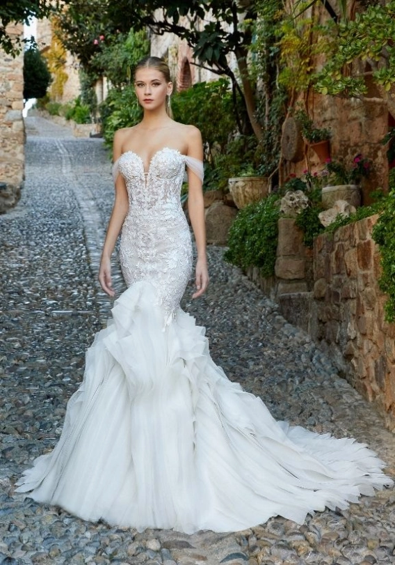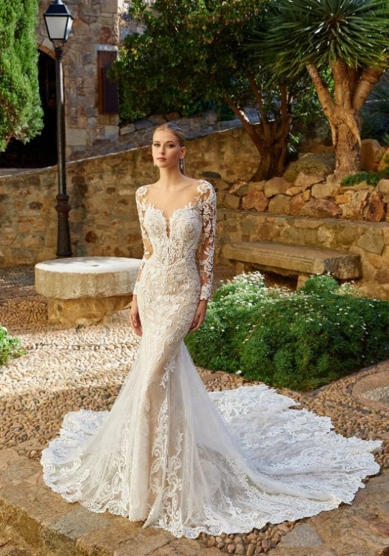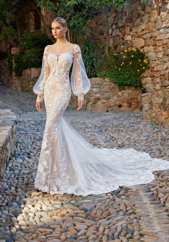 Brimming with romance and elegance, the GIVERNY gown is effortlessly beautiful. She comes with detachable blouson sleeves which not only make this look super romantic, but also very versatile. And we cannot forget about that body-contouring mermaid silhouette, which is an ÉLYSÉE signature.