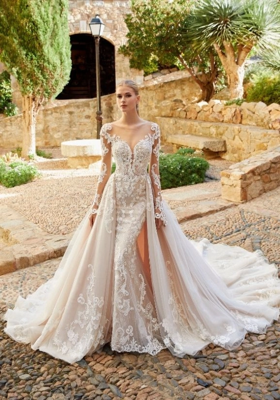 LOUVRE is bringing the ultimate drama in all the most gorgeous ways! You'll absolutely channel modern royalty with her detachable A-line overskirt, the detachable long lace sleeves, and deep sweetheart neckline bodice.