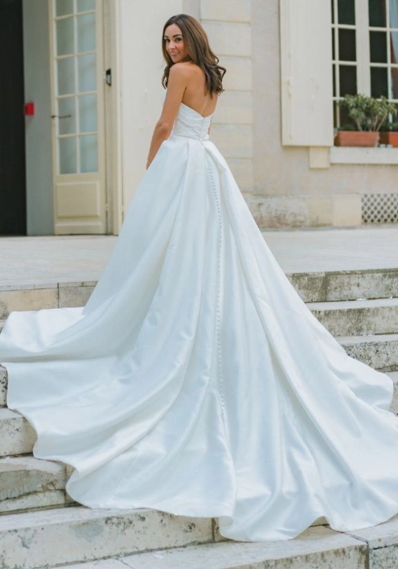 One of the most exciting parts of the journey for me was finding the dress. I knew exactly what I wanted. I was looking for something timeless. I didn’t want to look back on photos in ten or twenty years and feel like I had followed a trend. I wanted something that felt like me. Simple, elegant, and classic. When I found the Delancey gown, everything clicked. The silhouette was incredibly flattering. It hugged in all the right places but still moved beautifully. The slit added a modern twist without taking away from the timeless feel. One of my favourite features was the button-down back that ran the full length. It added such a delicate, vintage-inspired detail that felt subtle but special.