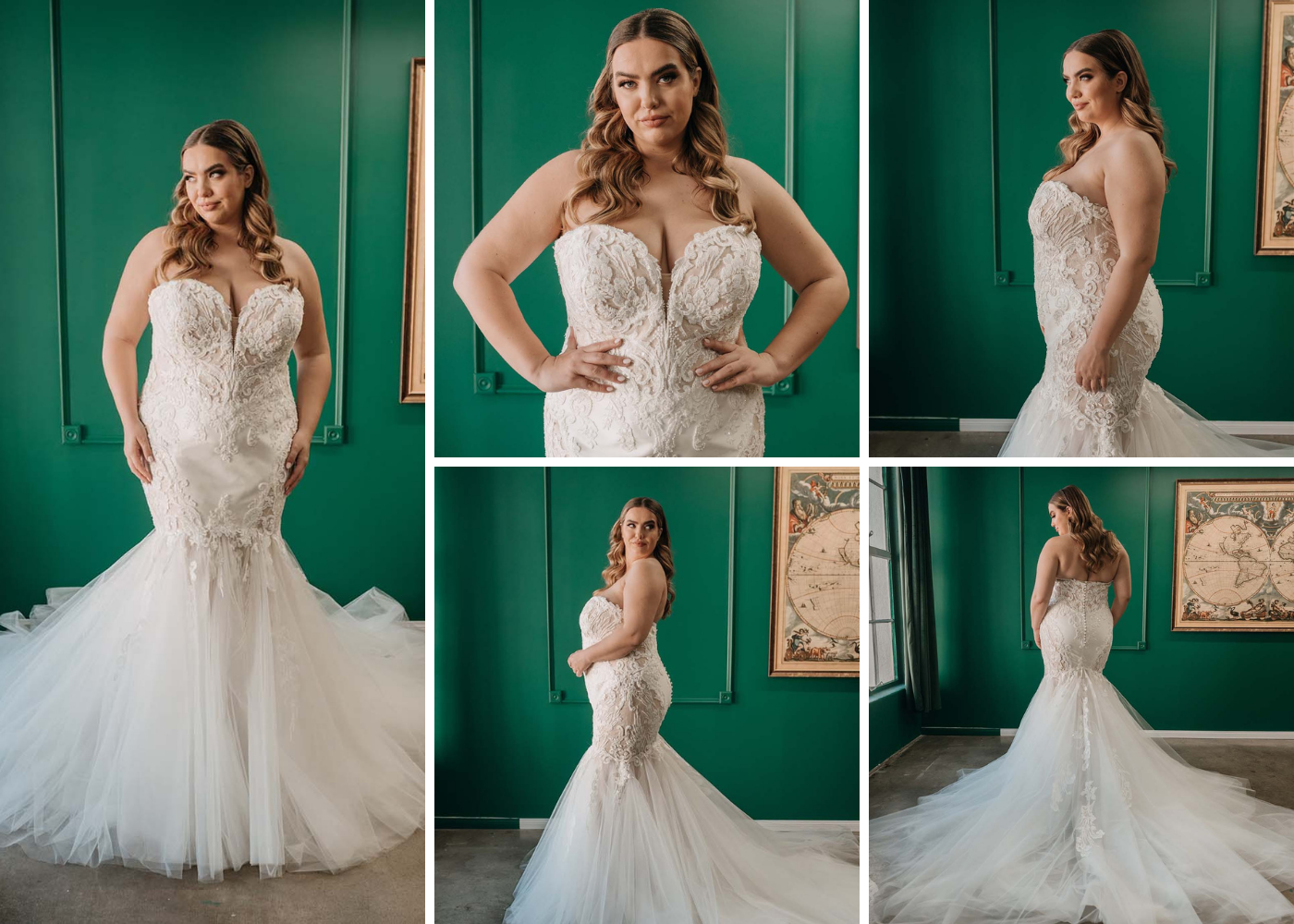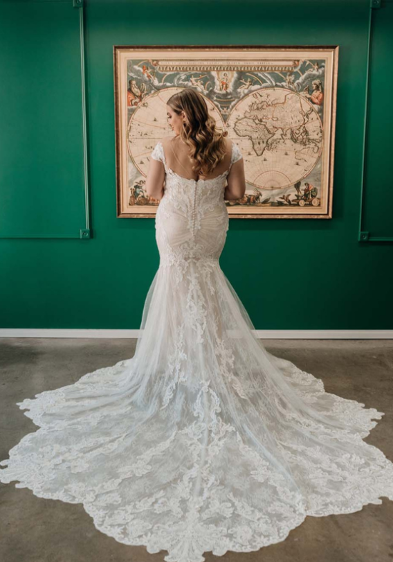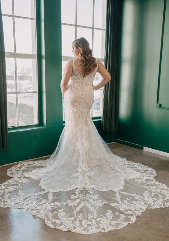 HÉLÈNE X Édition has it going on! She is sleek and sexy, but also delicate and unique. Her lace design, body-contouring fit, and the signature ÉLYSÉE sculpted hem train is what we rave about when we see this gown